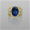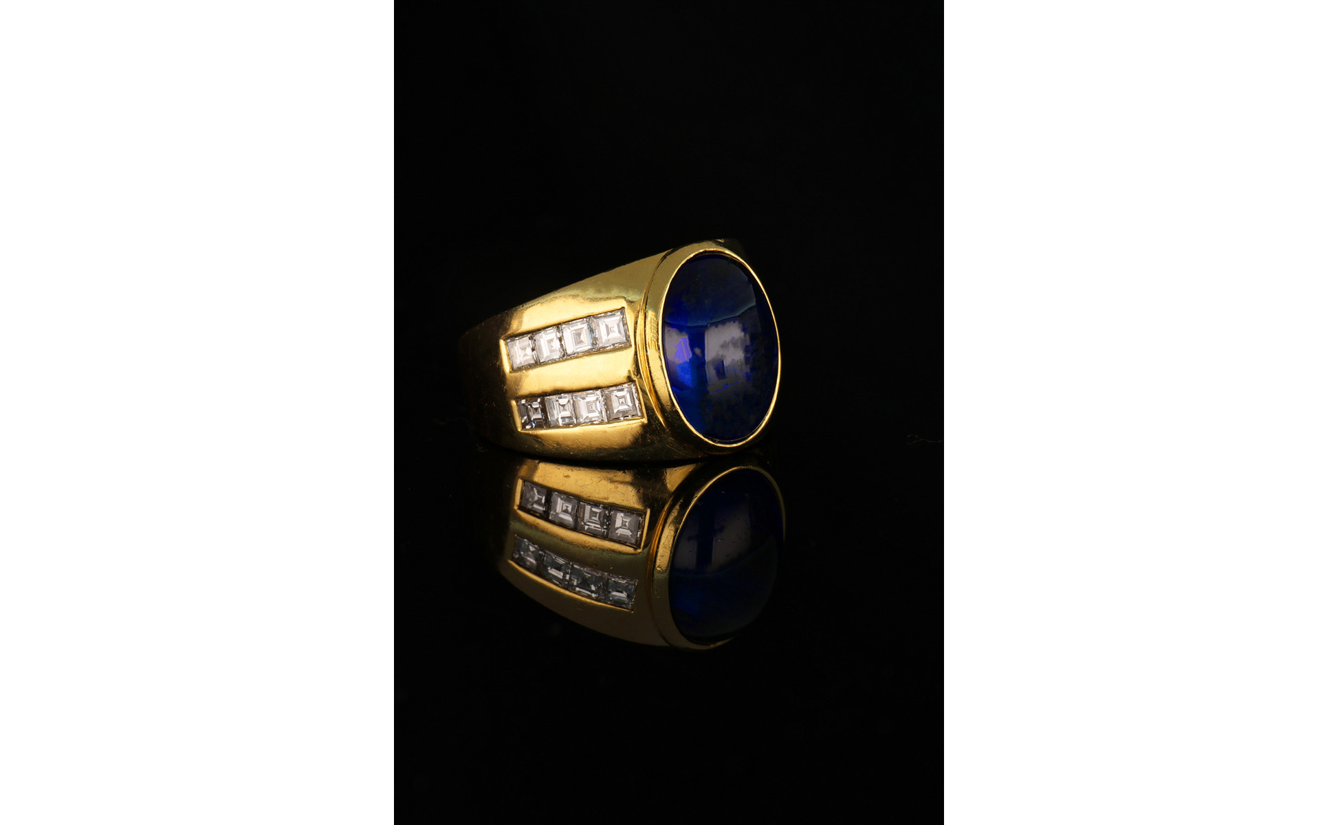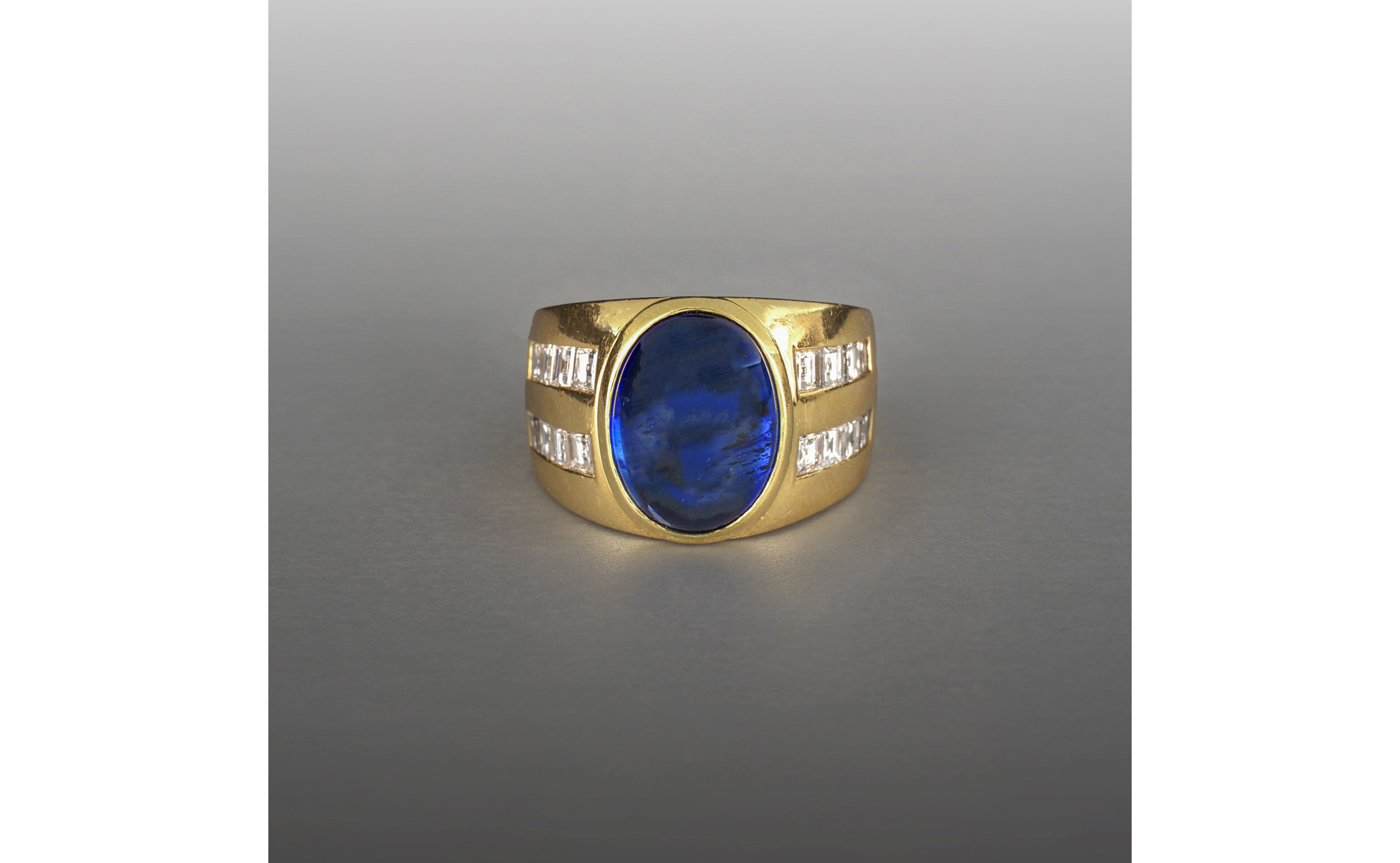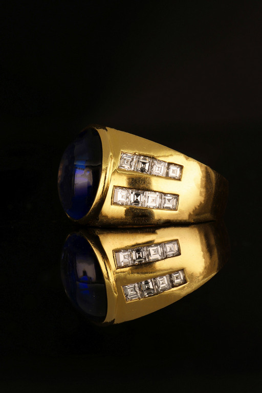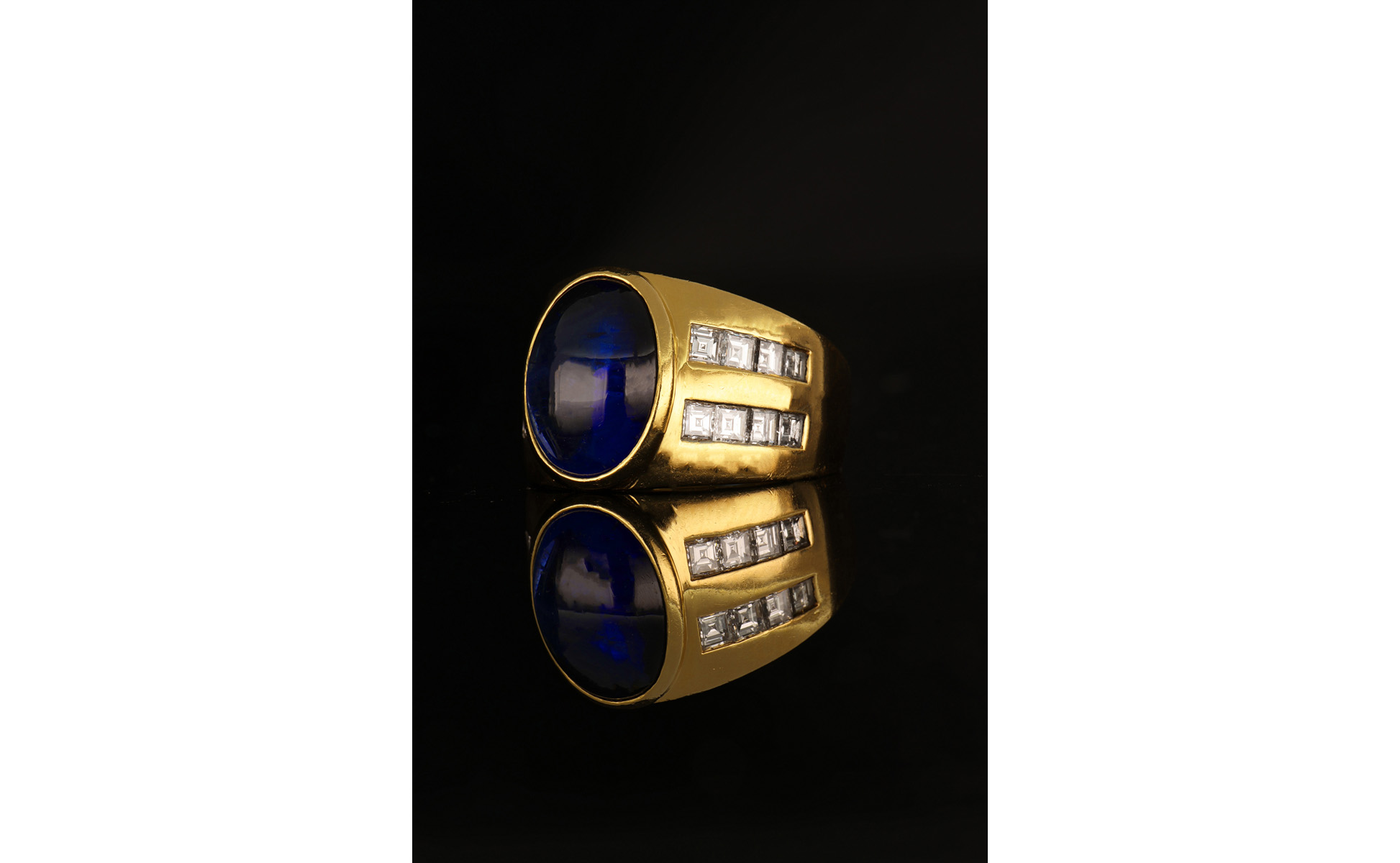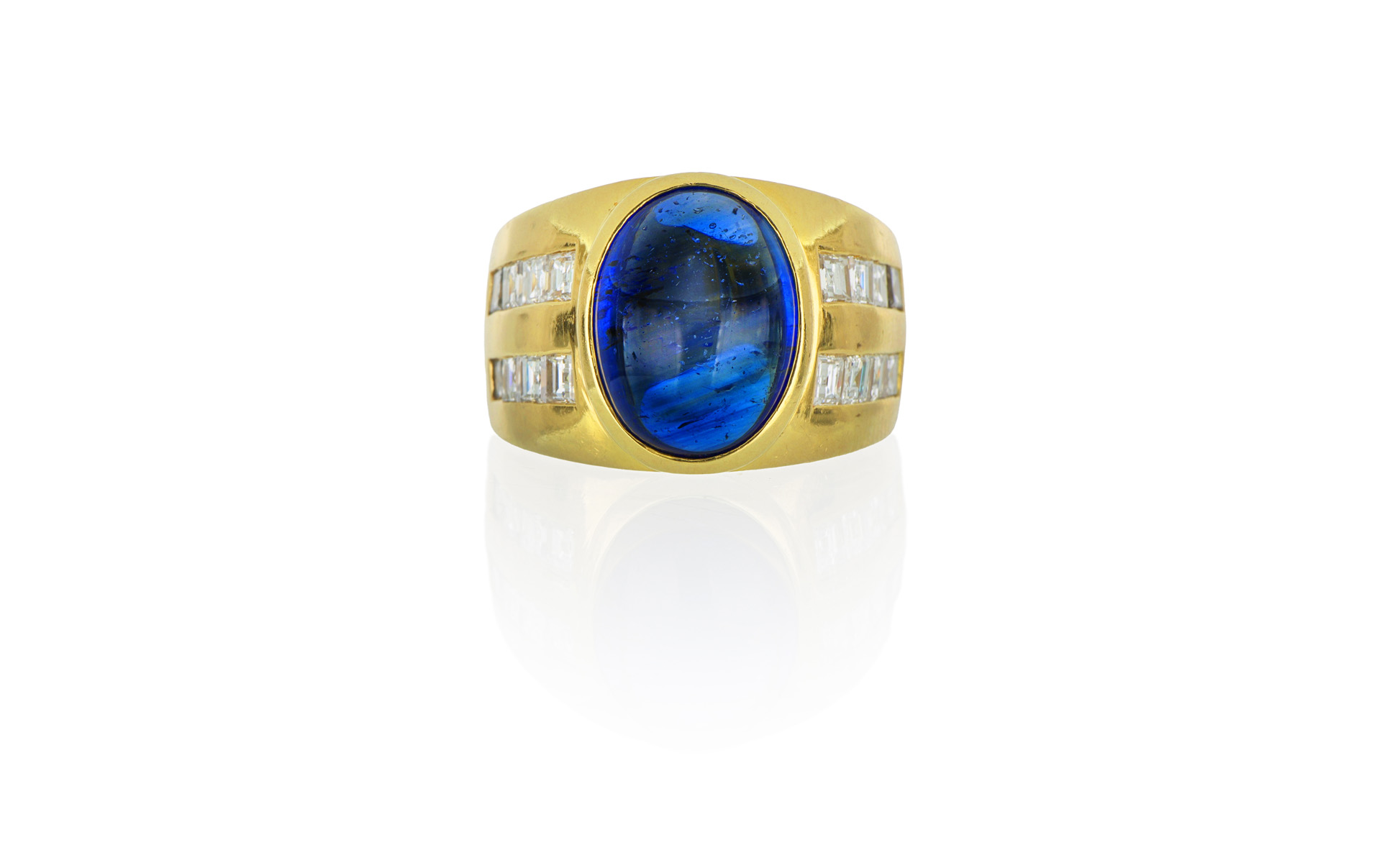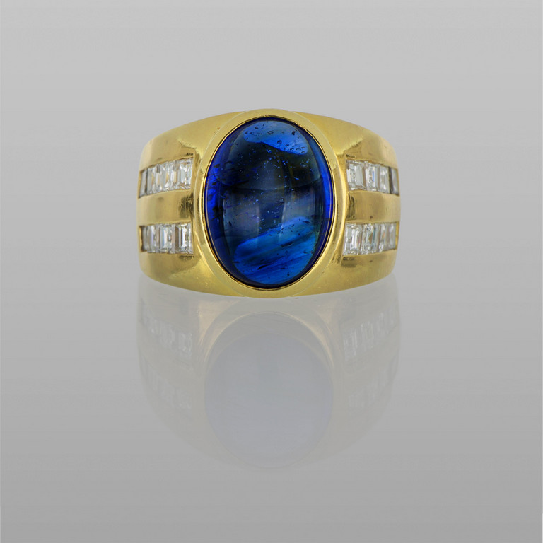 Anello fascione in oro giallo con 16 diamanti taglio carrè sui montanti per stimati 1 60 ct al centro importante zaffiro di forma ovale taglio cabochon di stimati 10 / 11 ct.