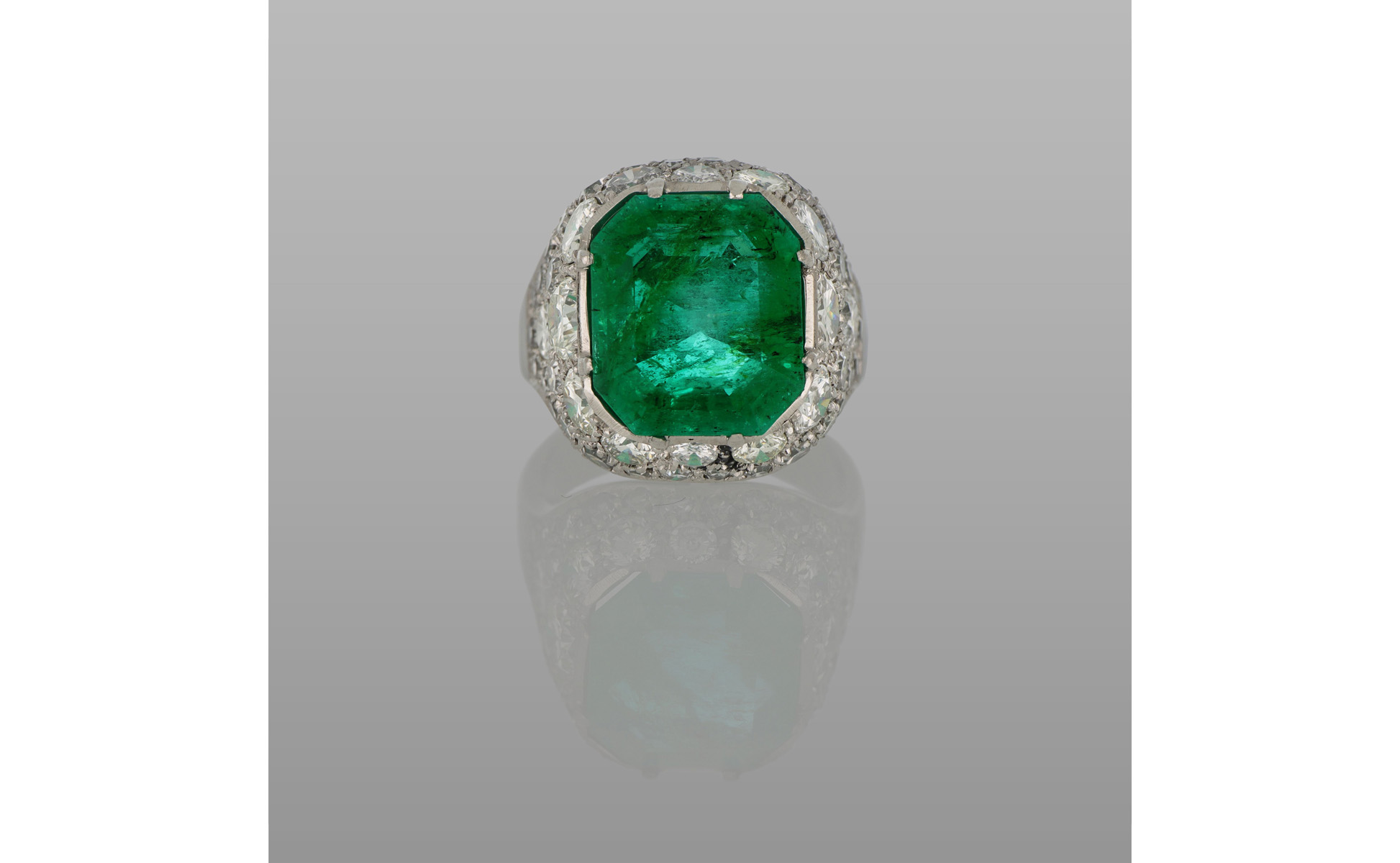 Anello in platino a musone al centro smeraldo colombiano taglio ottagonale di ct. 8 80 diamanti incassati su tutta la superficie per ct. 4 5 ca.