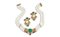 Parure composta da collier a doppio di filo di perle coltivate da 8 5 mm di diametro in oro giallo e bianco con grande smeraldo di stimati 9 00 ct accompagnato da diamanti di forma rotonda taglio a brillante e baguette per stimati 2 50 ct complessivi e 3 rubini cabochon. Orecchini con due mezze perle diamanti rubini e smeraldi chiusura a clip battente senza perno.