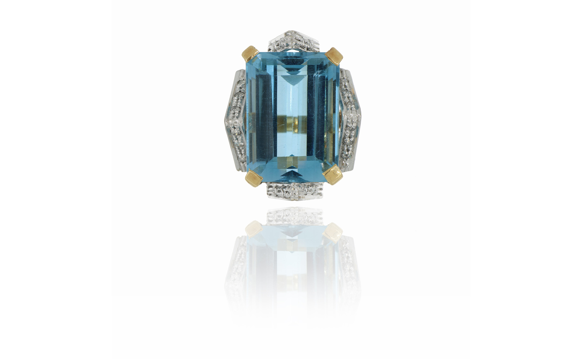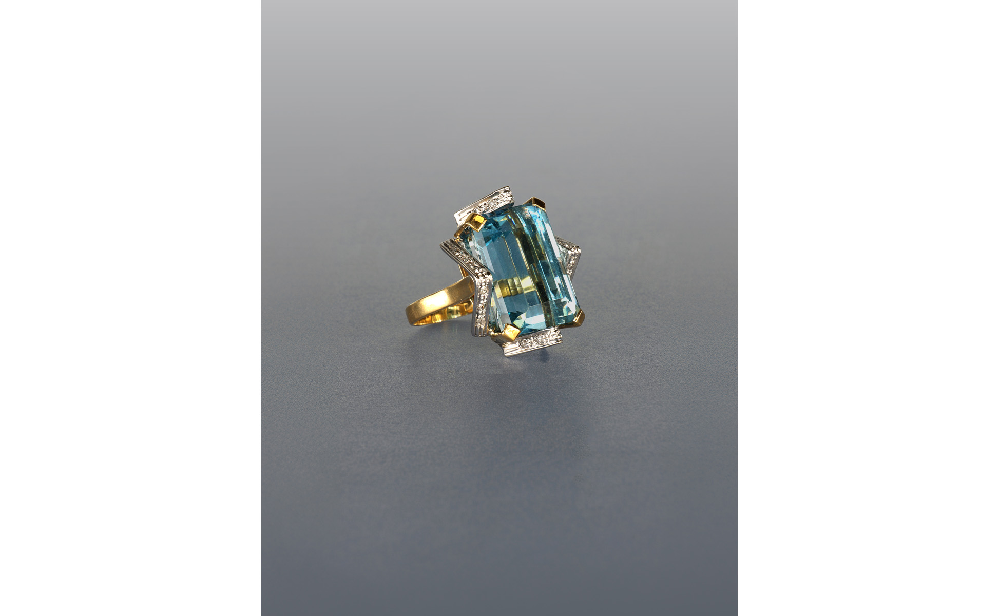 Grande e geometrico anello con acquamarina la gemma di ct. 25 0 ca. esibisce un colore eccezionalmente intenso e una vivacità tipica del migliore materiale brasiliano conosciuto come 'Santa Maria' la montatura in oro giallo e bianco ricorda geometrie del periodo Deco'.