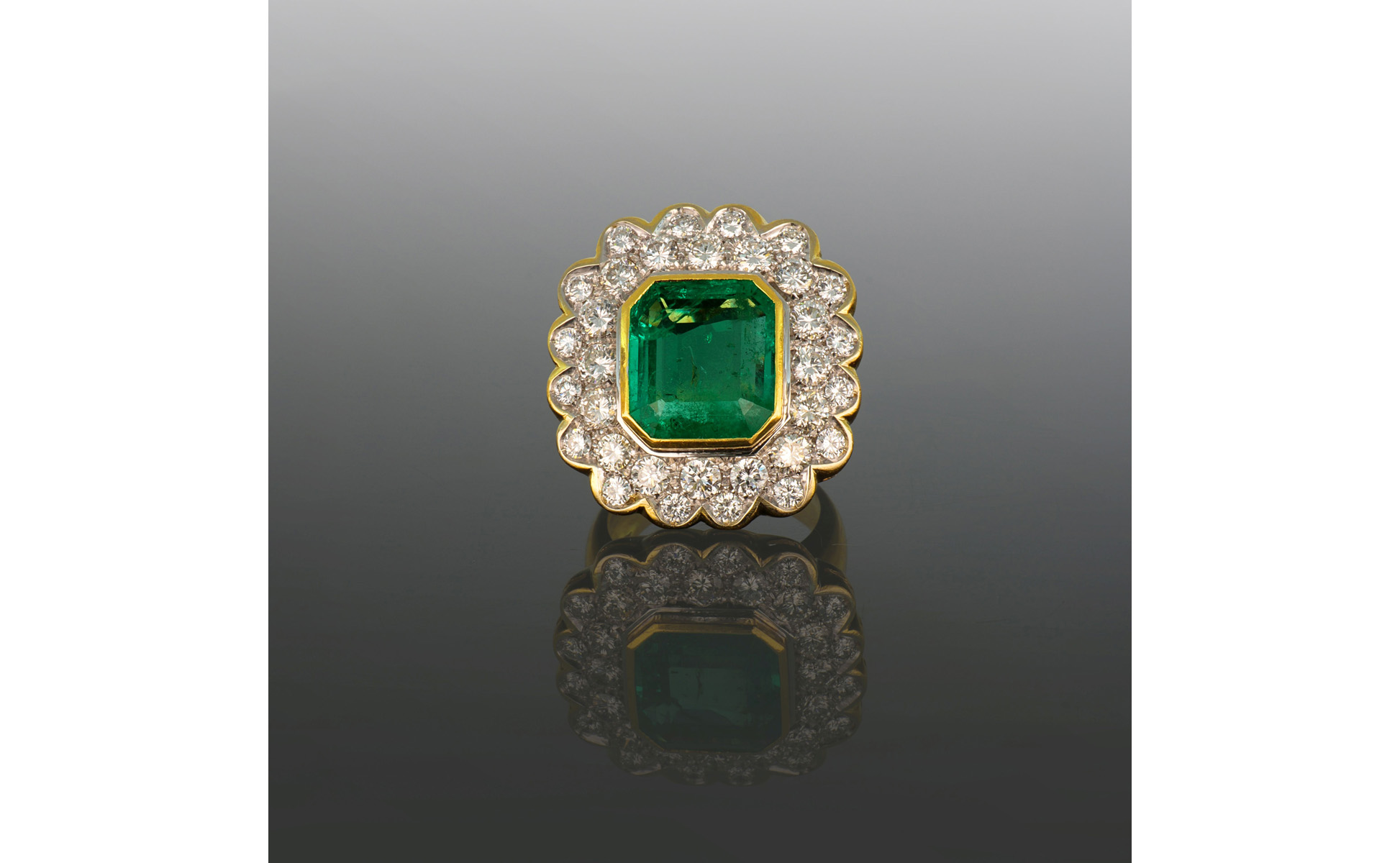 Grande anello in oro giallo e bianco a fiore la corposa montatura smerlata racchiude un grande e limpido smeraldo colombiano di ct. 9 0 ca. contornato da due giri di diamanti taglio brillante per ct. 5 0 ca.