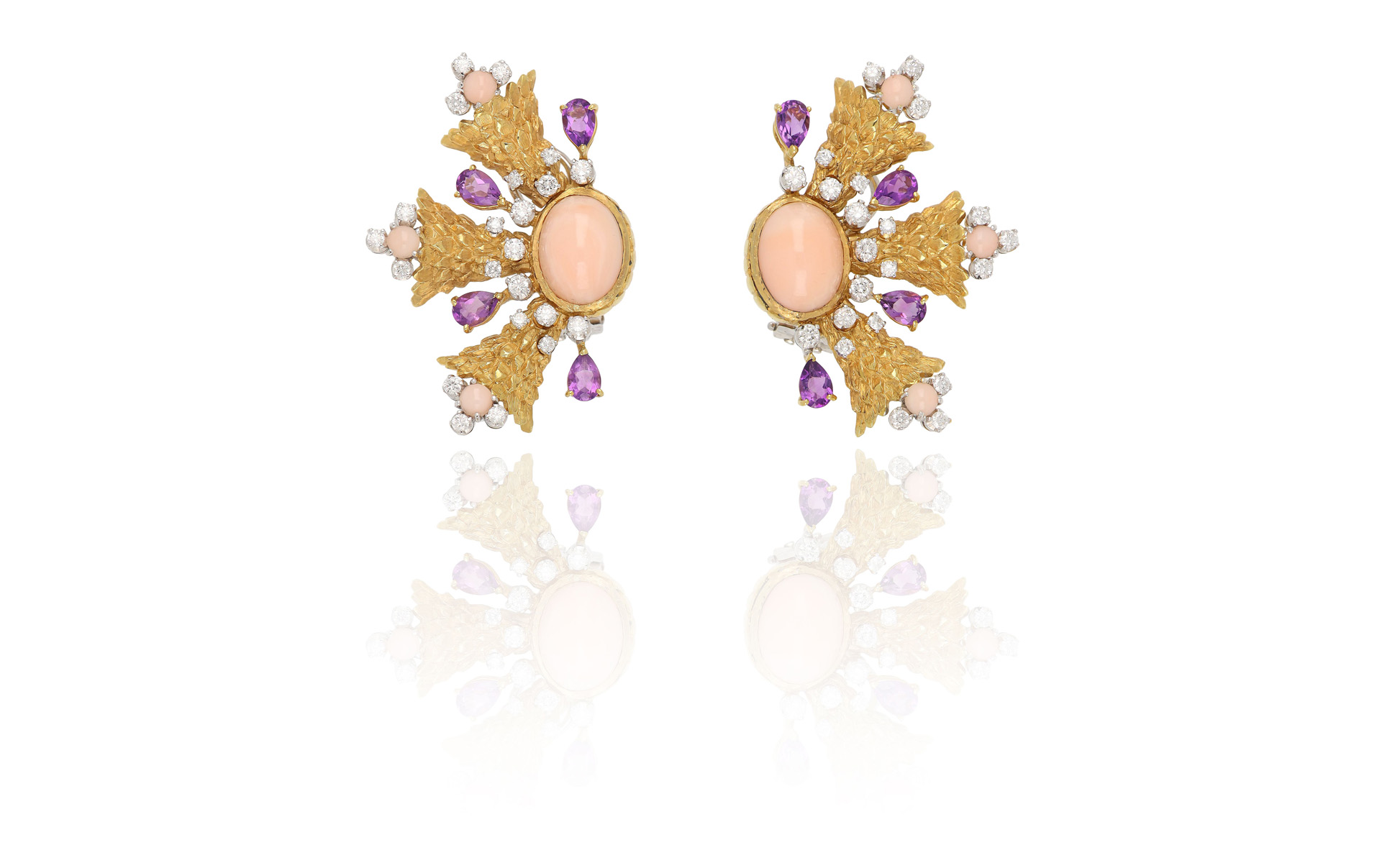 CHIAPPE - Grandi orecchini in oro giallo lavorato a corteccia con cabochon di corallo rosa gocce di ametista e diamanti tondi taglio a brillante per stimati 1 30 ct.chiusura a clip battente con perno