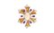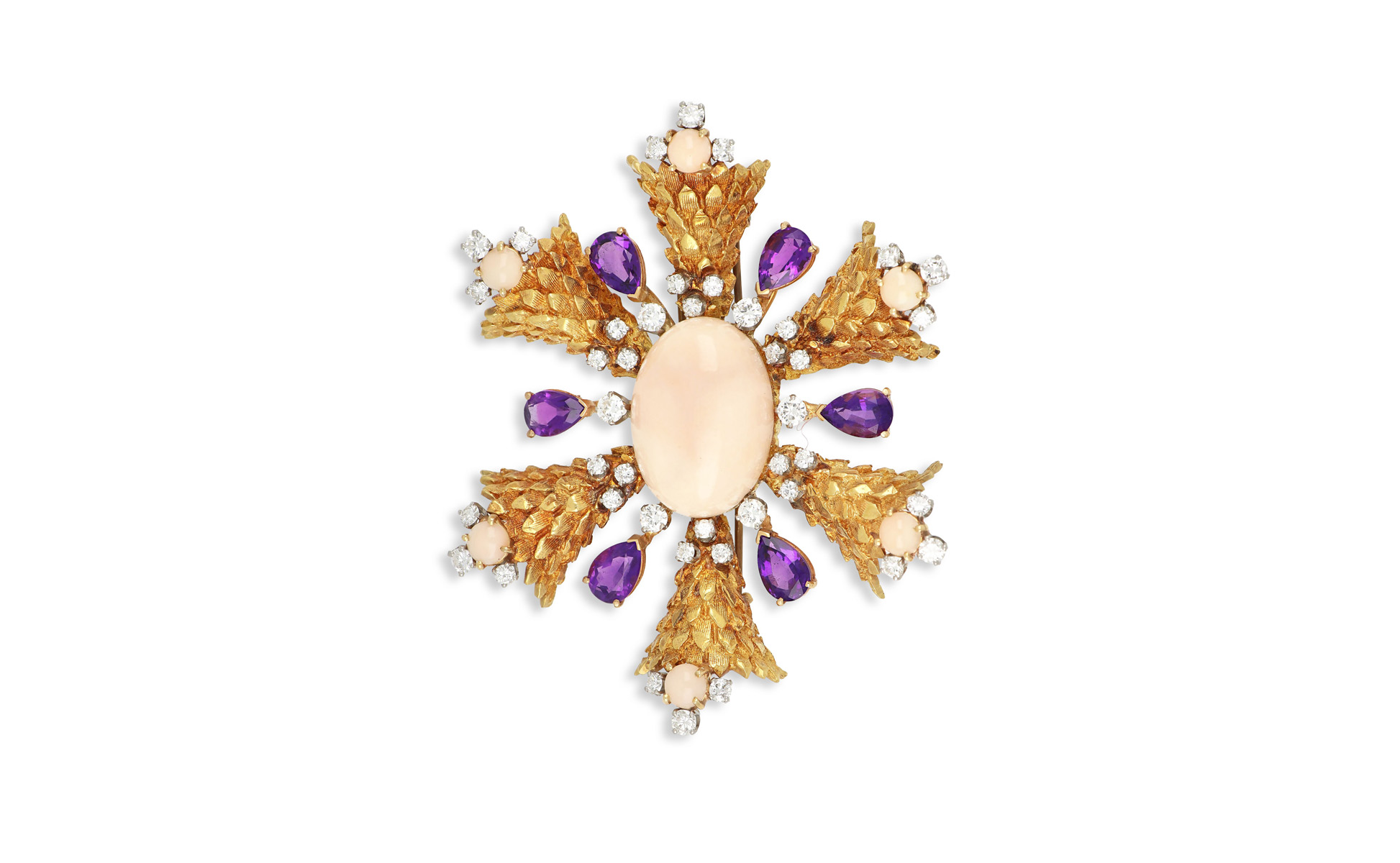 CHIAPPE - Grande spilla a rosone in oro giallo lavorato a corteccia con cabochon di corallo rosa gocce di ametista e diamanti tondi taglio a brillante per stimati 4 ct circa.