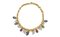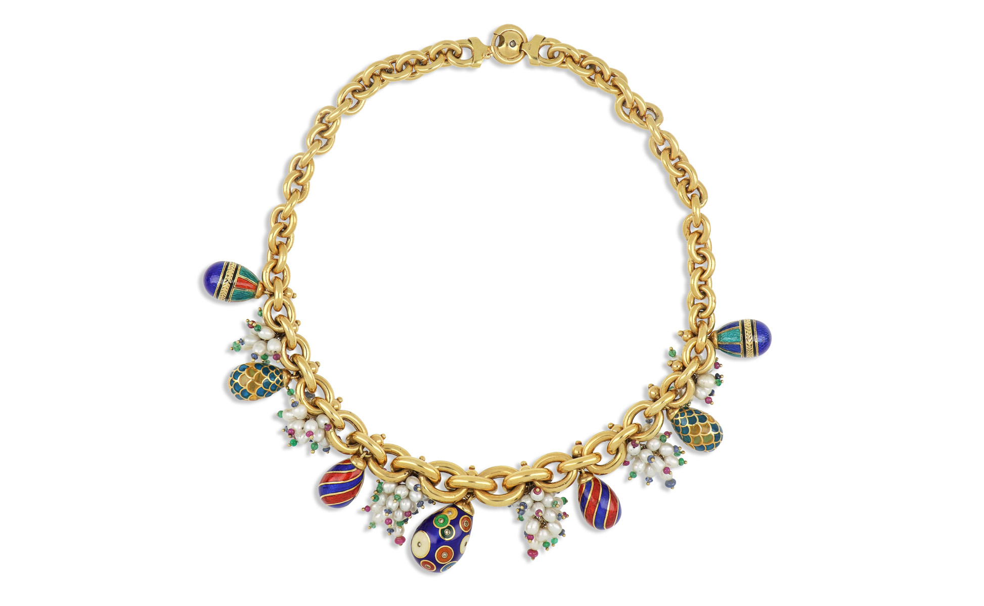 Girocollo in oro giallo a catenone con charmes pendenti alternati tra ovetti smaltati multicolore e perline di fiume impreziosite da beads di zaffiri rubini e smeraldi.