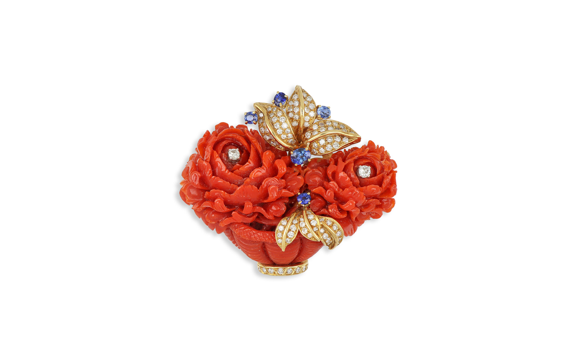 FILIPPO MORONI - Grande spilla in oro giallo con importante corallo rubrum a rappresentare un cesto floreale con diamanti e zaffiri incastonati.