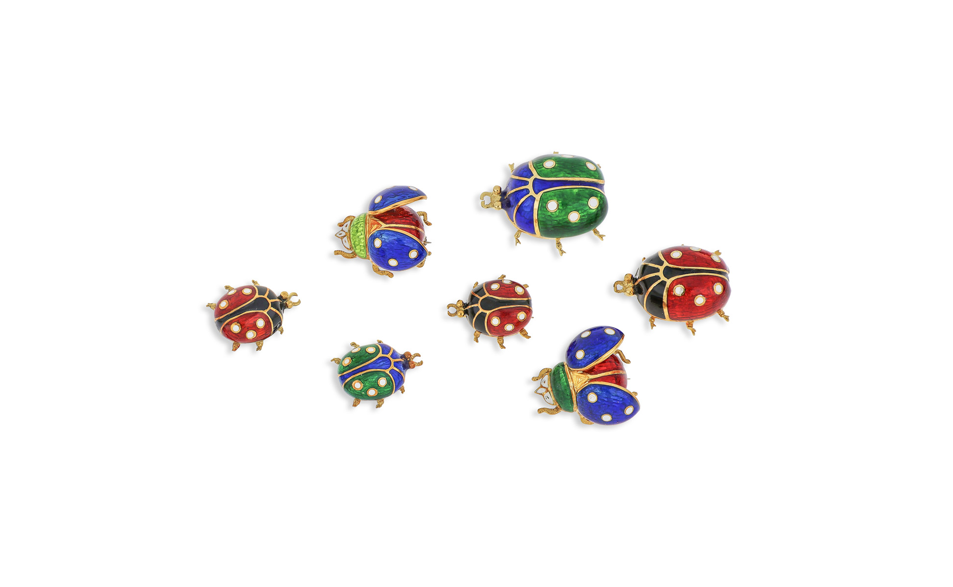 Set composto da cinque spille e un paio di orecchini in oro giallo tutte a rappresentare coloratissime coccinelle alcune con ali aperte decorate a smalti guilloché.