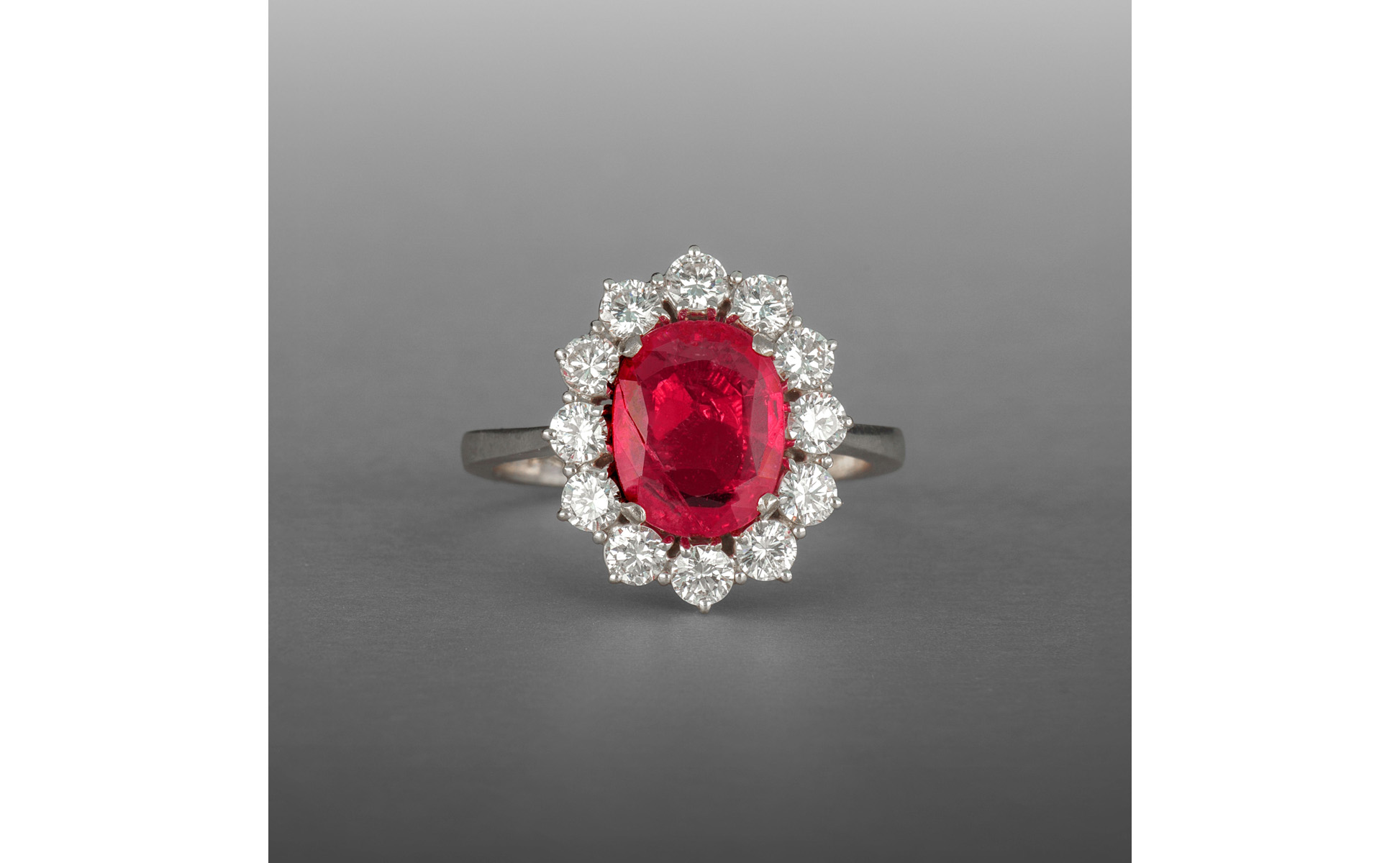 Classico anello a margherita in oro bianco al centro un vivace rubino birmano non scaldato a contorno dodici diamanti taglio brillante per ct.1 20 ca.
