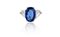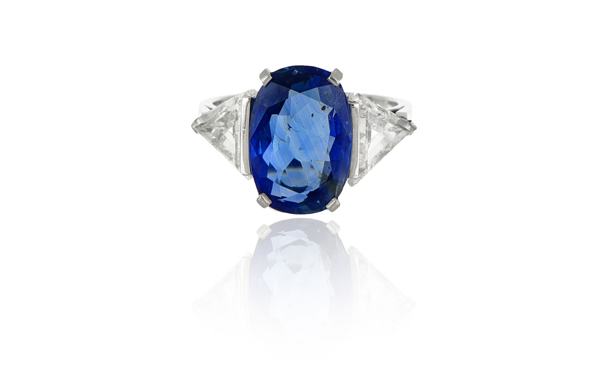 Anello in platino a tre pietre con zaffiro ovale centrale di 7 1 ct accompagnato da report gemmologico CISGEM attestante l'origine Ceylon e l'assenza di trattamento termico e due diamanti laterali di forma triangolare del peso rispettivamente di 1 25 ct e 1 34 ct