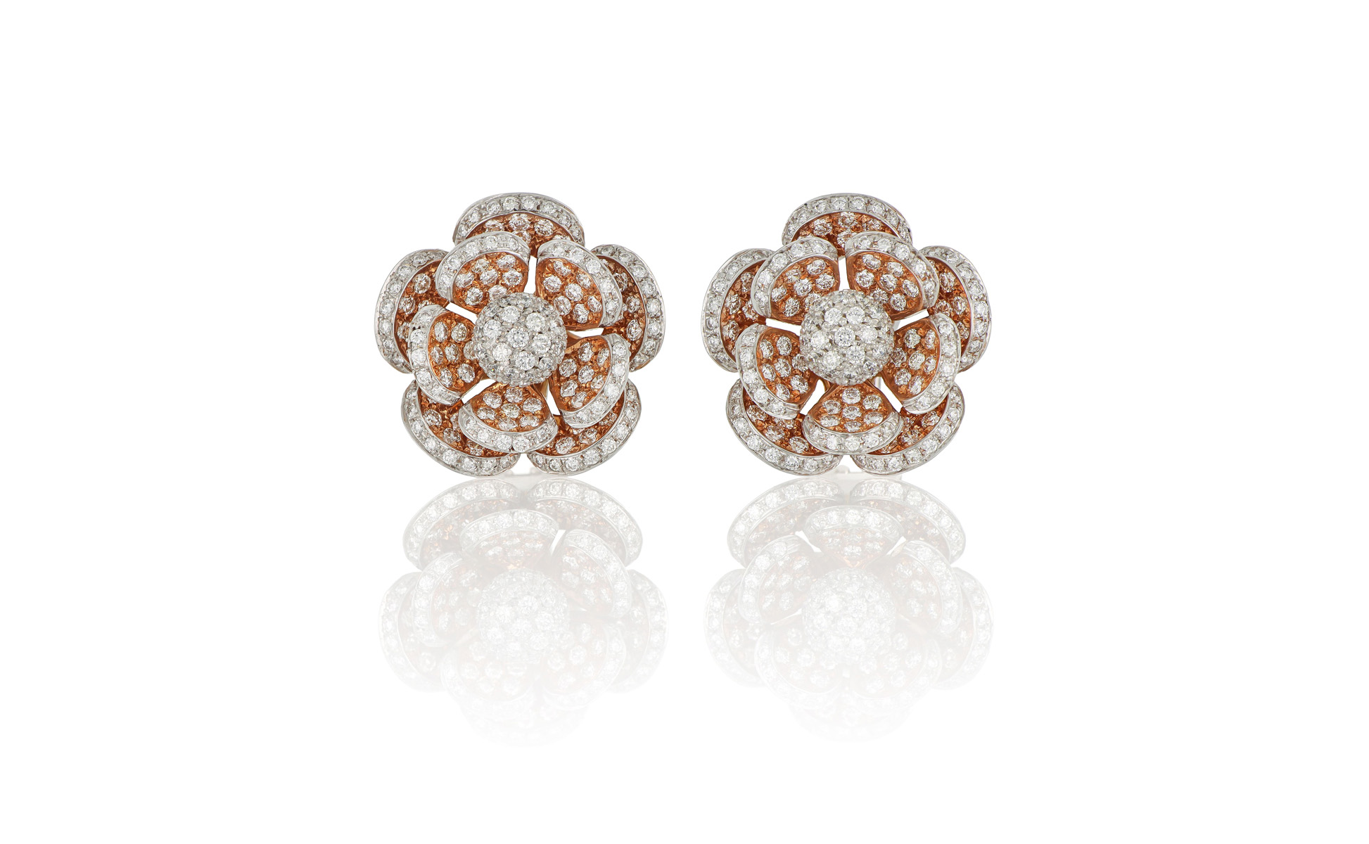 Orecchini in oro rosa a fiore di forma rotonda impreziositi da intero pavé di diamanti taglio a brillante.