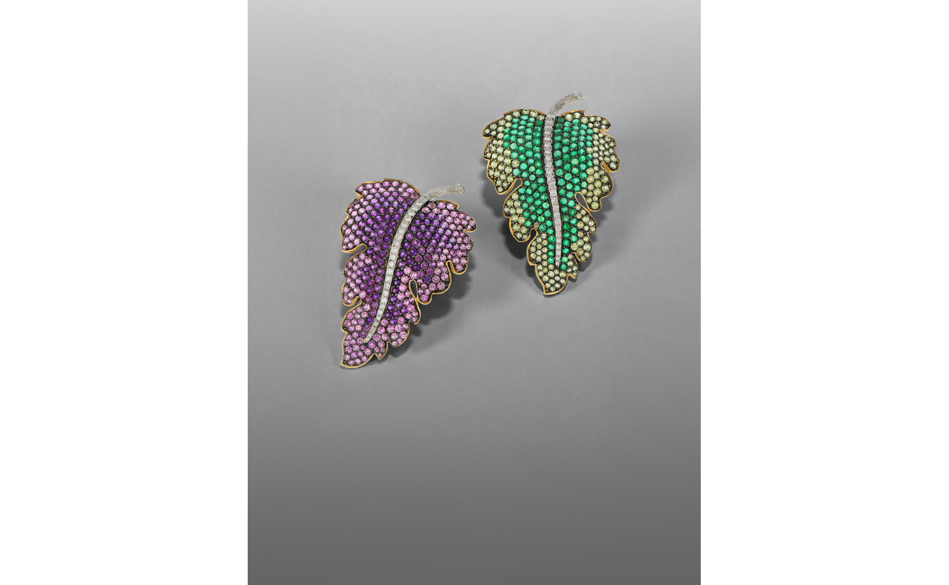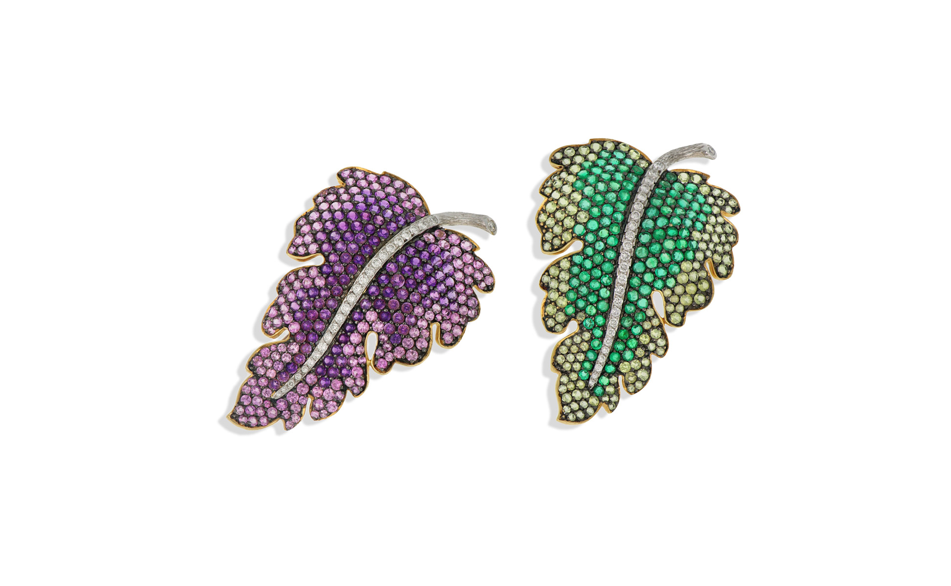 Eleganti e raffinate coppia di spille francesi a guisa di foglia di vite in platino e oro con ametiste smeraldi prasiolite e diamanti.