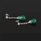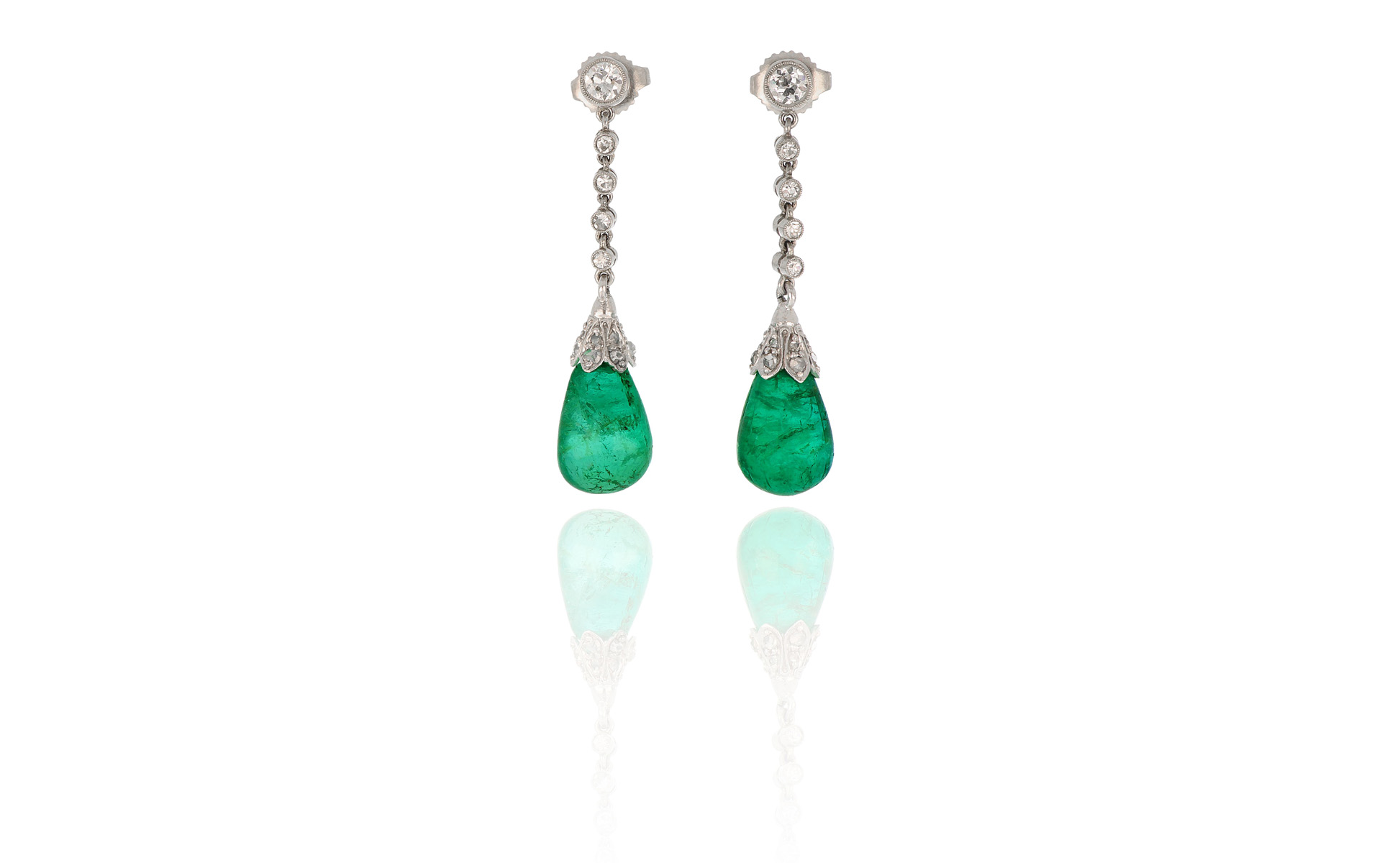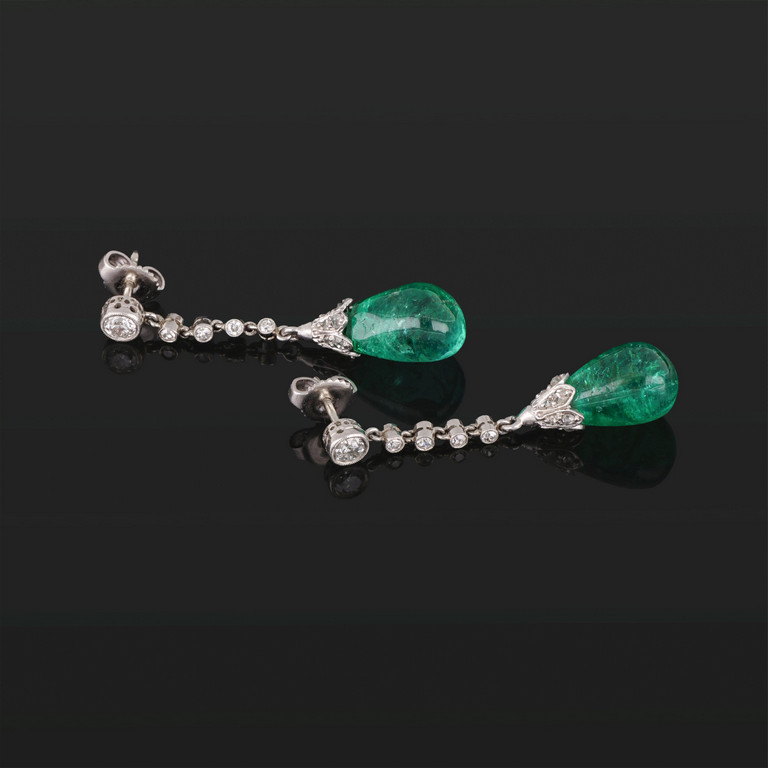 Orecchini in oro bianco 14 kt a pendente con piccoli diamanti taglio 8/8 e circular con due smeraldi colombiani a goccia cabochon di stimati 12/13 ct complessivi.