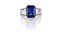 Importante anello in platino con zaffiro di forma rettangolare taglio a gradini di ottimo colore stimato tra gli 8 5 e i 9 ct.Elegante montatura con diamanti taglio baguette per stimati 4 ct complessivi.