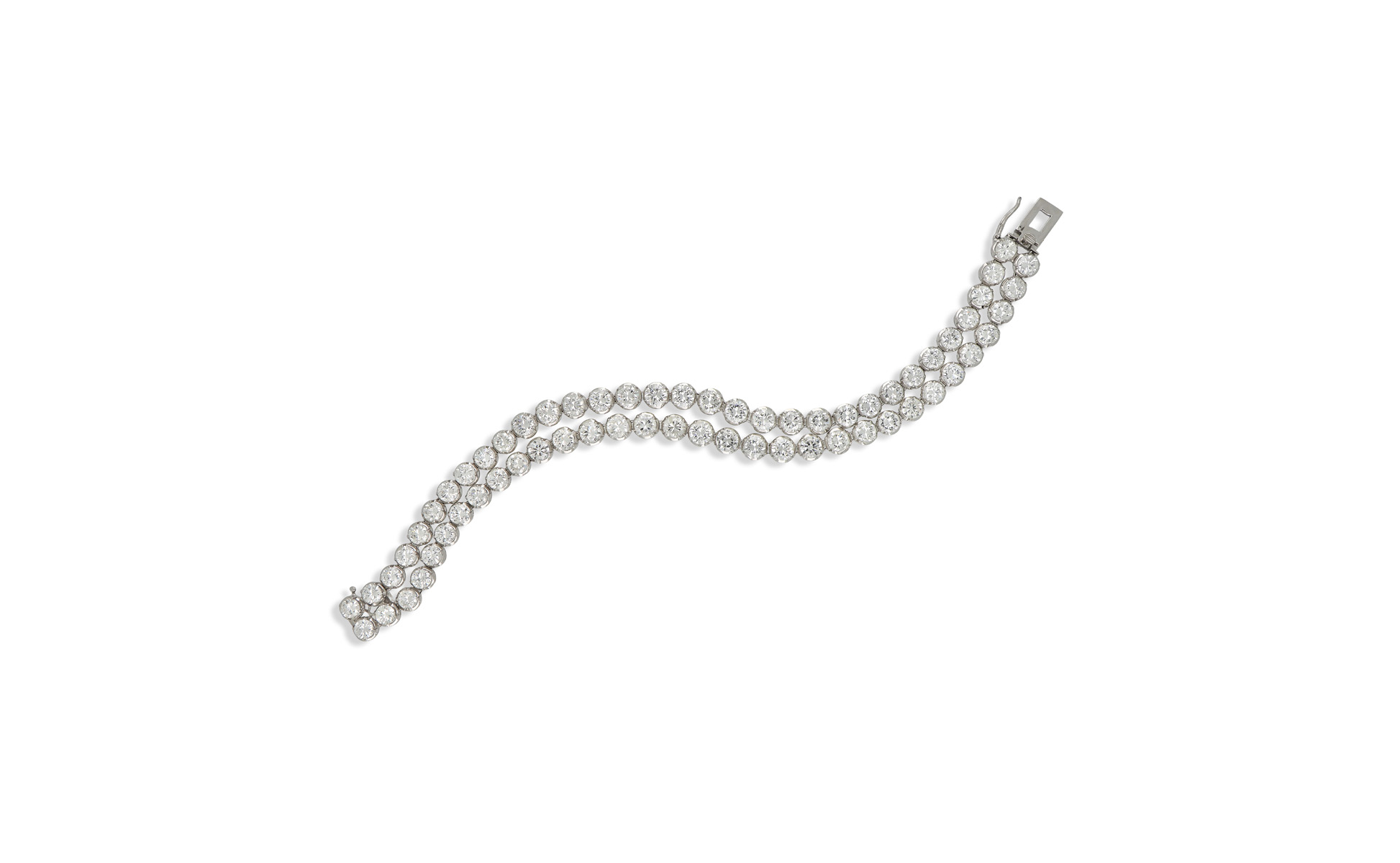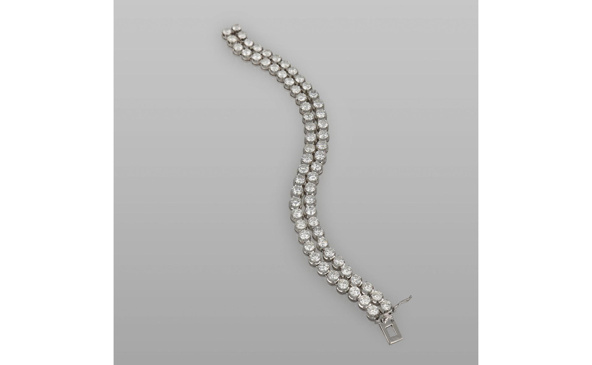 Importante doppio tennis in oro bianco con 64 diamanti di forma rotonda taglio a brillante per un totale stimato di circa 22 ct. La qualità delle pietre è compresa nella gamma VS/SI2 e di colore molto alto. Punzonato 86GE (Guglielmi).