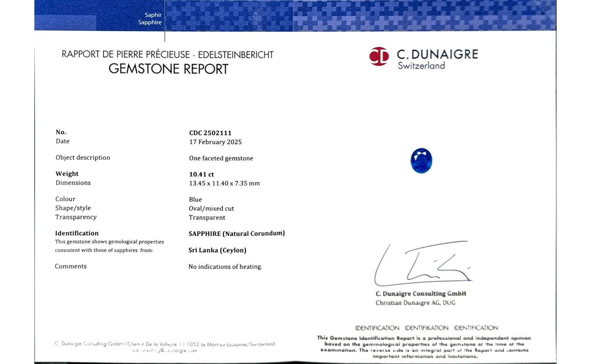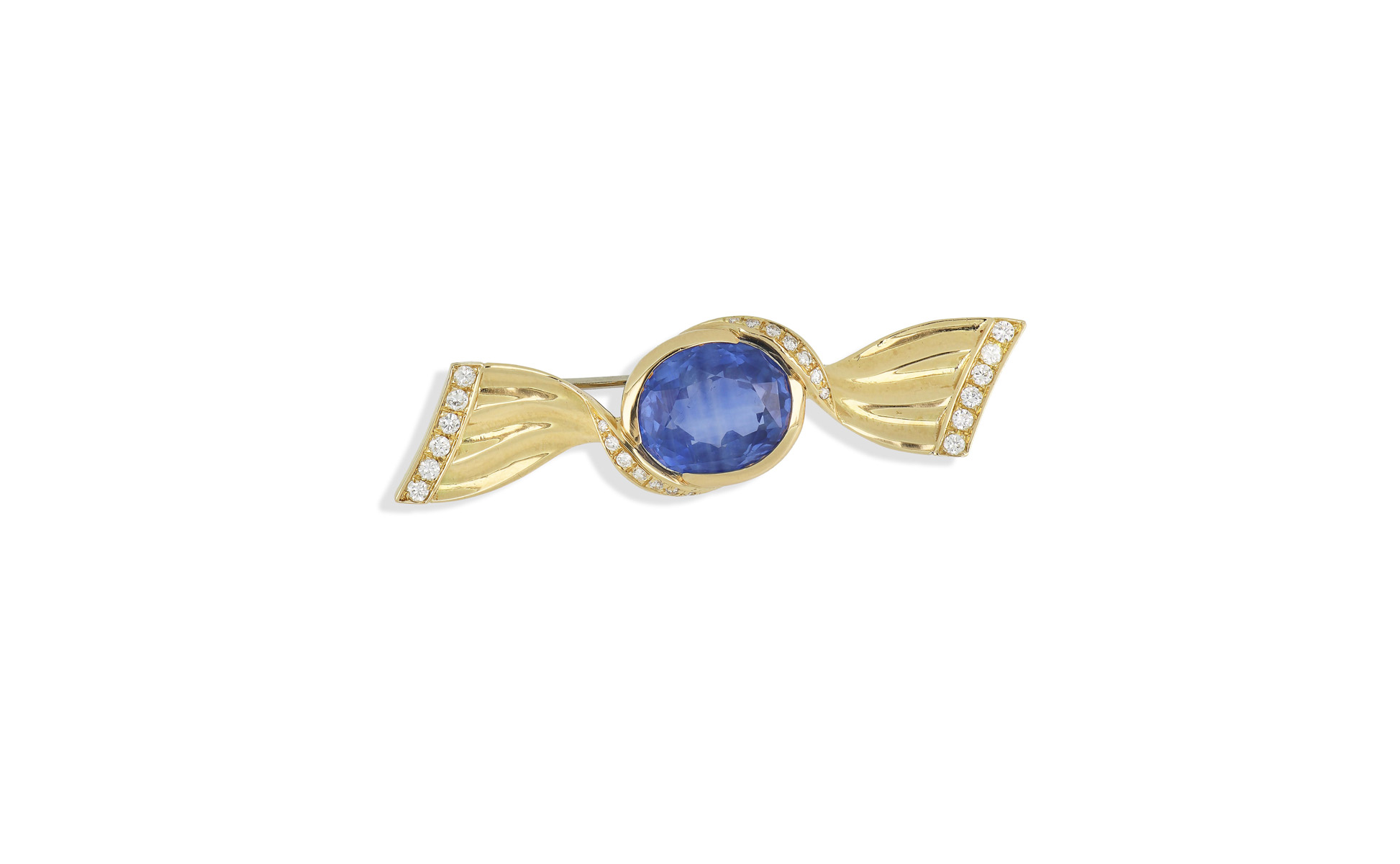 Spilla in oro giallo a guisa di fiocco con zaffiro naturale ovale di 10 41 ct accompagnato da certificato gemmologico svizzero che ne attesta l'assenza di trattamento termico e l'origine Ceylon.
