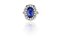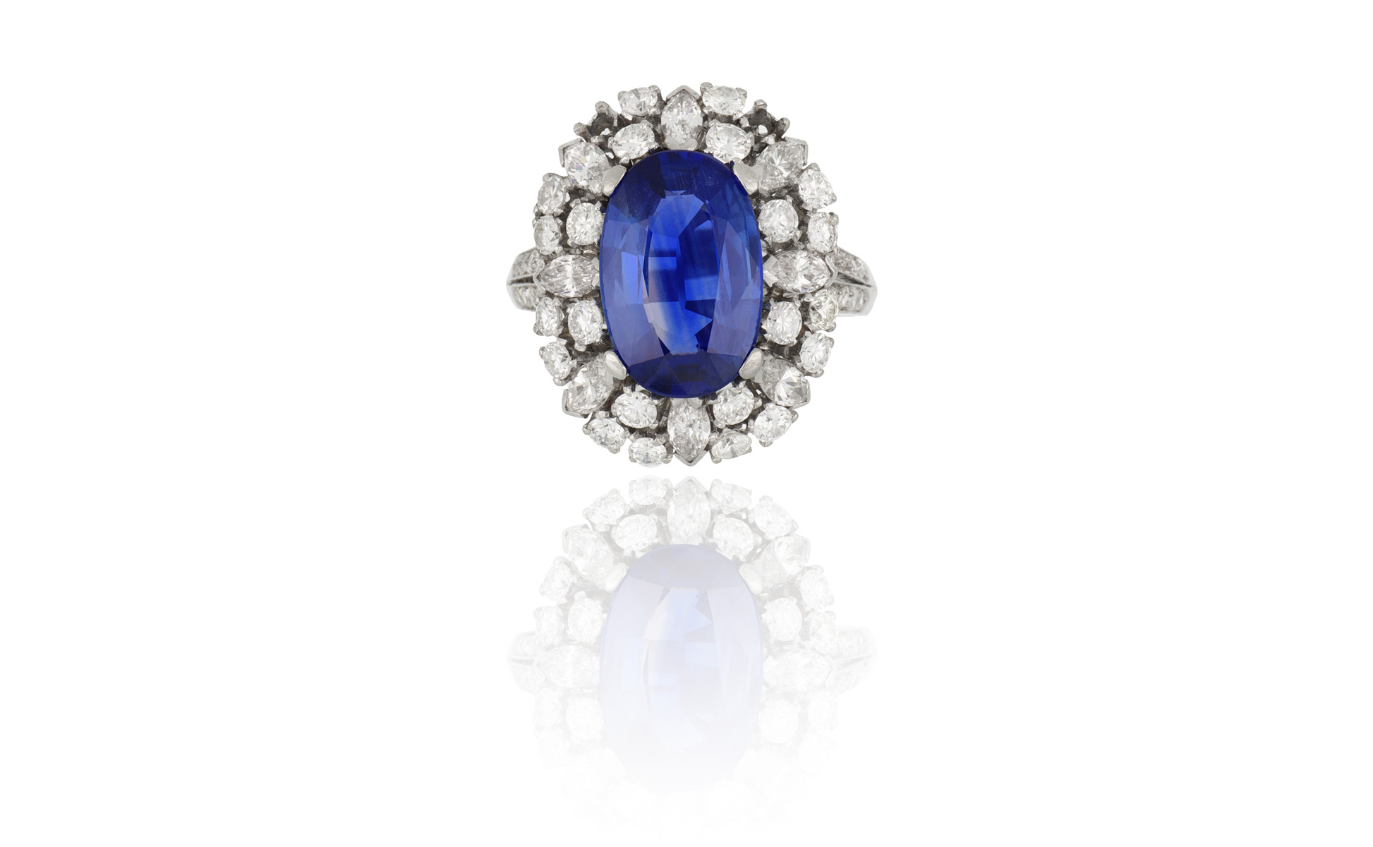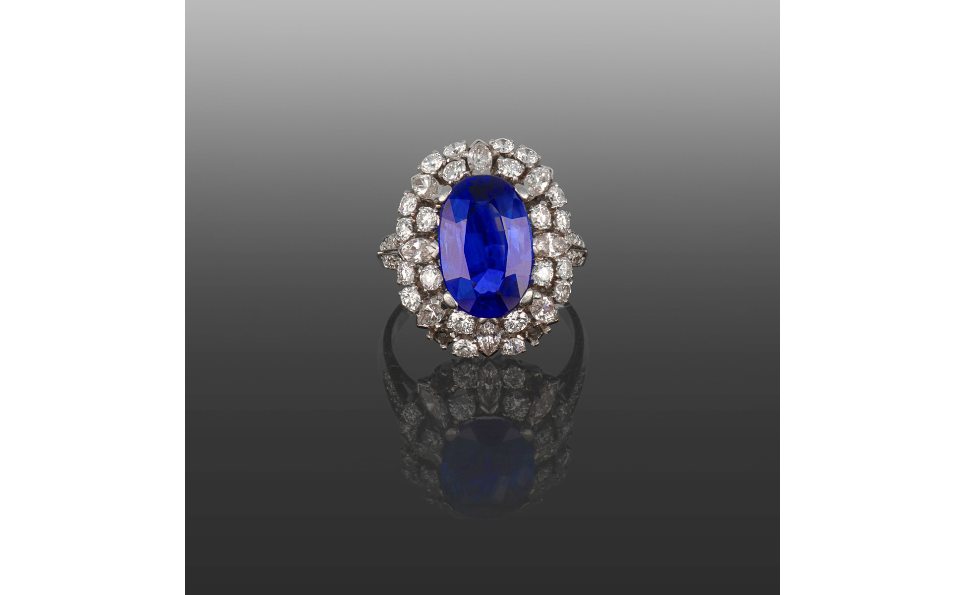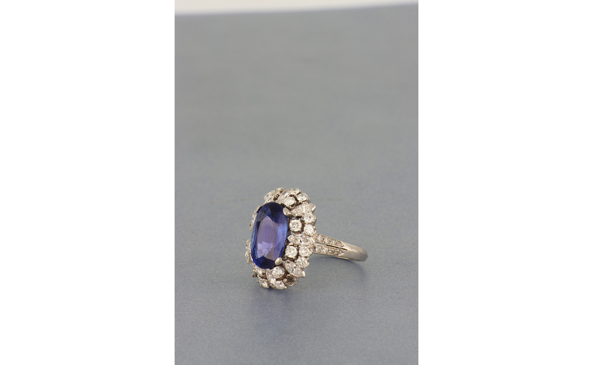 Anello in platino anni 30 con zaffiro naturale di 5 41 ct di forma cuscino. Contornato da doppio giro di diamanti di forma rotonda e navette per stimati 2 60 ct complessivi.