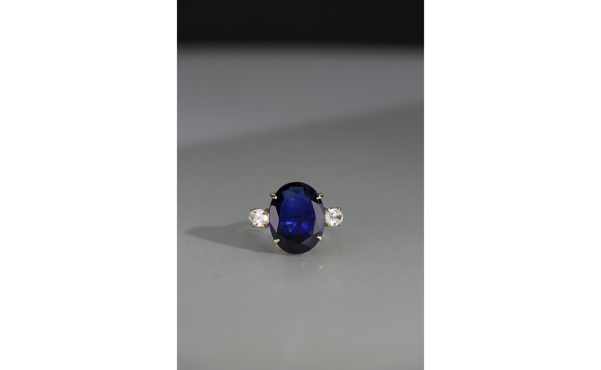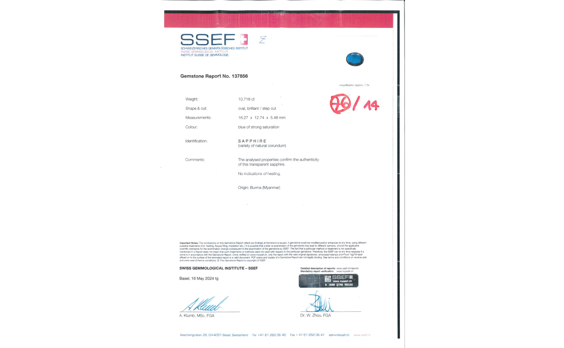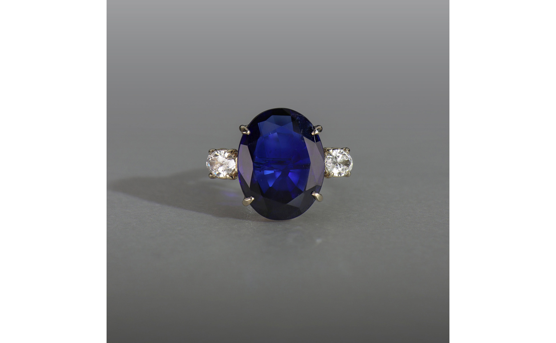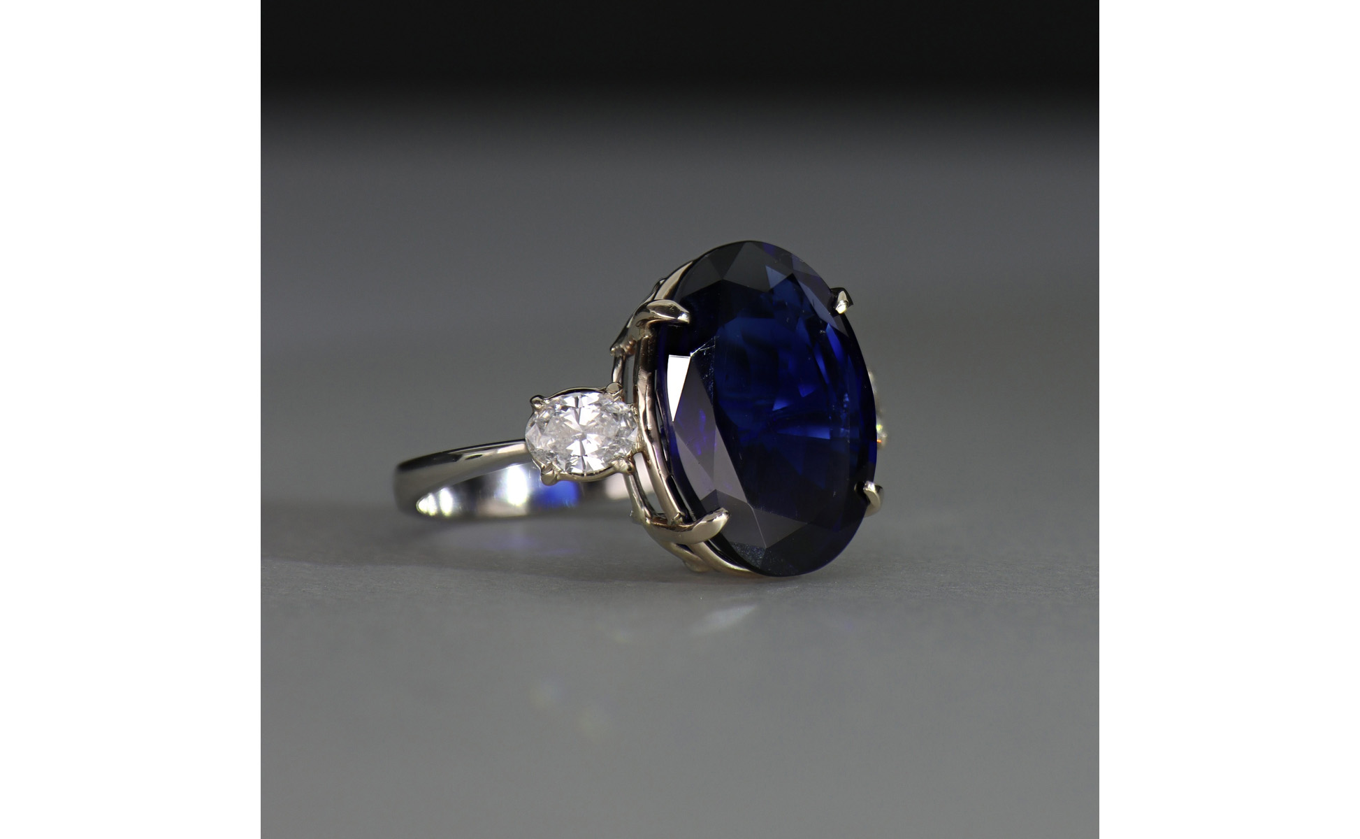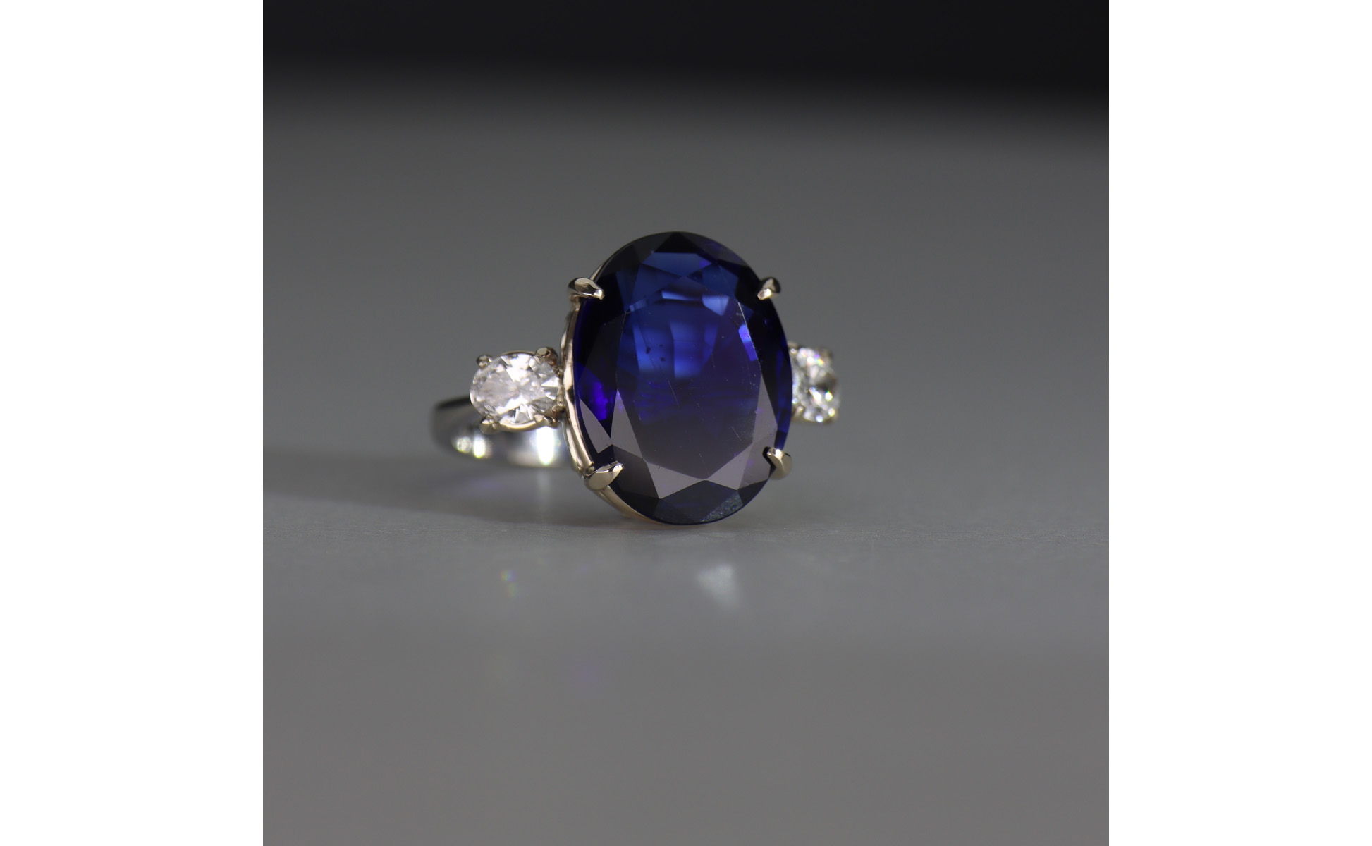 Importante anello in oro bianco con due diamanti laterali di forma ovale di stimati 1 ct complessivi e grande zaffiro naturale di forma ovale di 10 71 ct accompagnato da report gemmologico svizzero SSEF attestante l'origine birmana e l'assenza di trattamento termico.