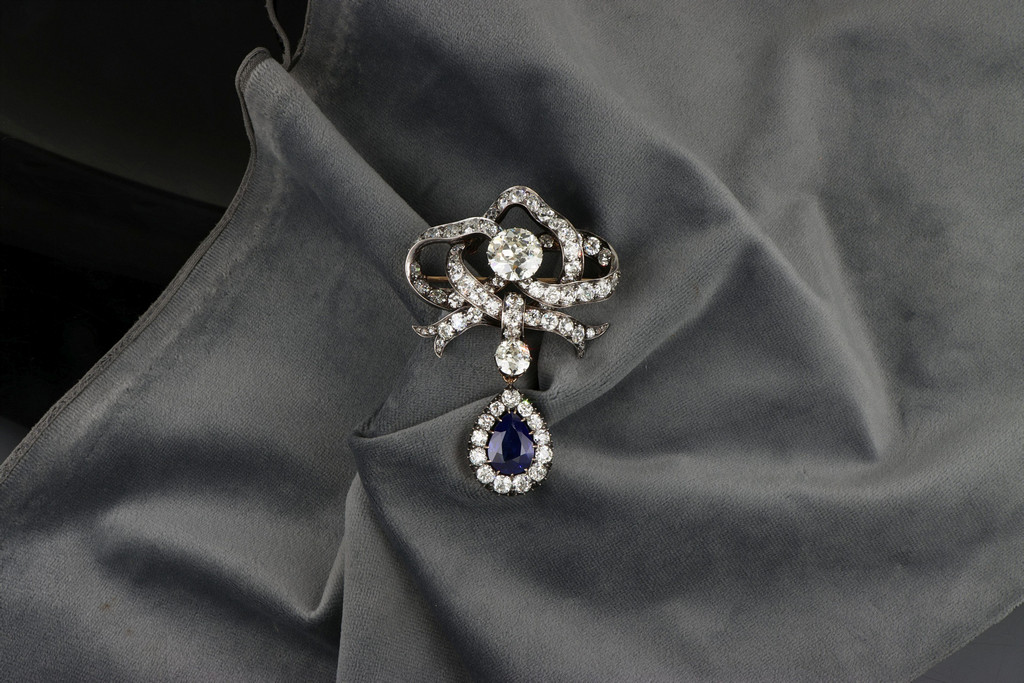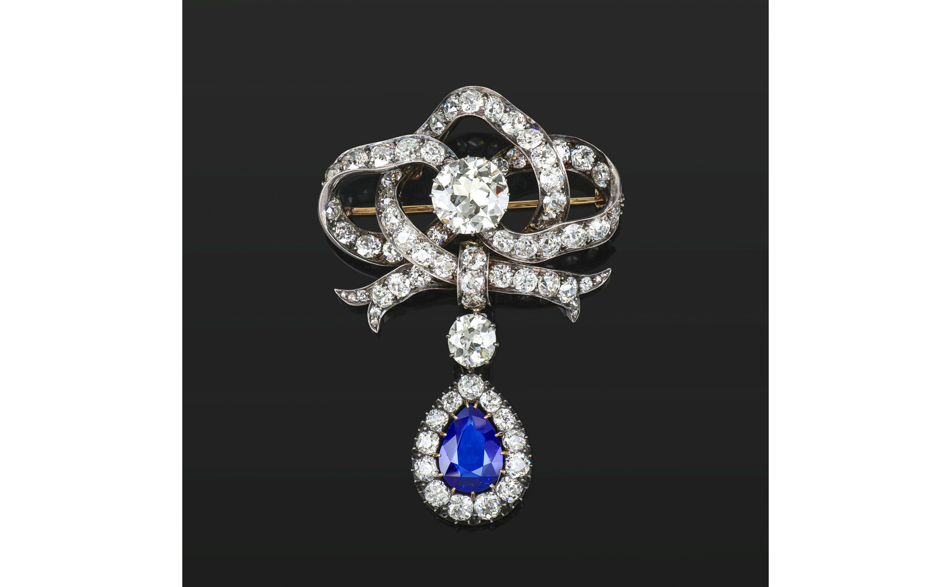 Pendente a goccia sormontata da un diamante di taglio antico di circa 1 80 ct (J/VS2) e importante e raro zaffiro naturale di forma a goccia di 5 18 ct accompagnato da report gemmologico svizzero SSEF attestante l'origine Kashmir e l'assenza di trattamento termico.