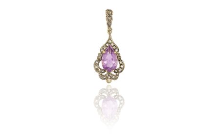Ciondolo in oro giallo e argento la lavorazione a volute abbraccia un quarzo ametista taglio a goccia ed è impreziosita da piccoli diamanti taglio rosa.