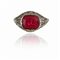 Anello in oro bianco traforato piccoli diamanti tra le volute incise al centro una pietra rossa di sintesi.