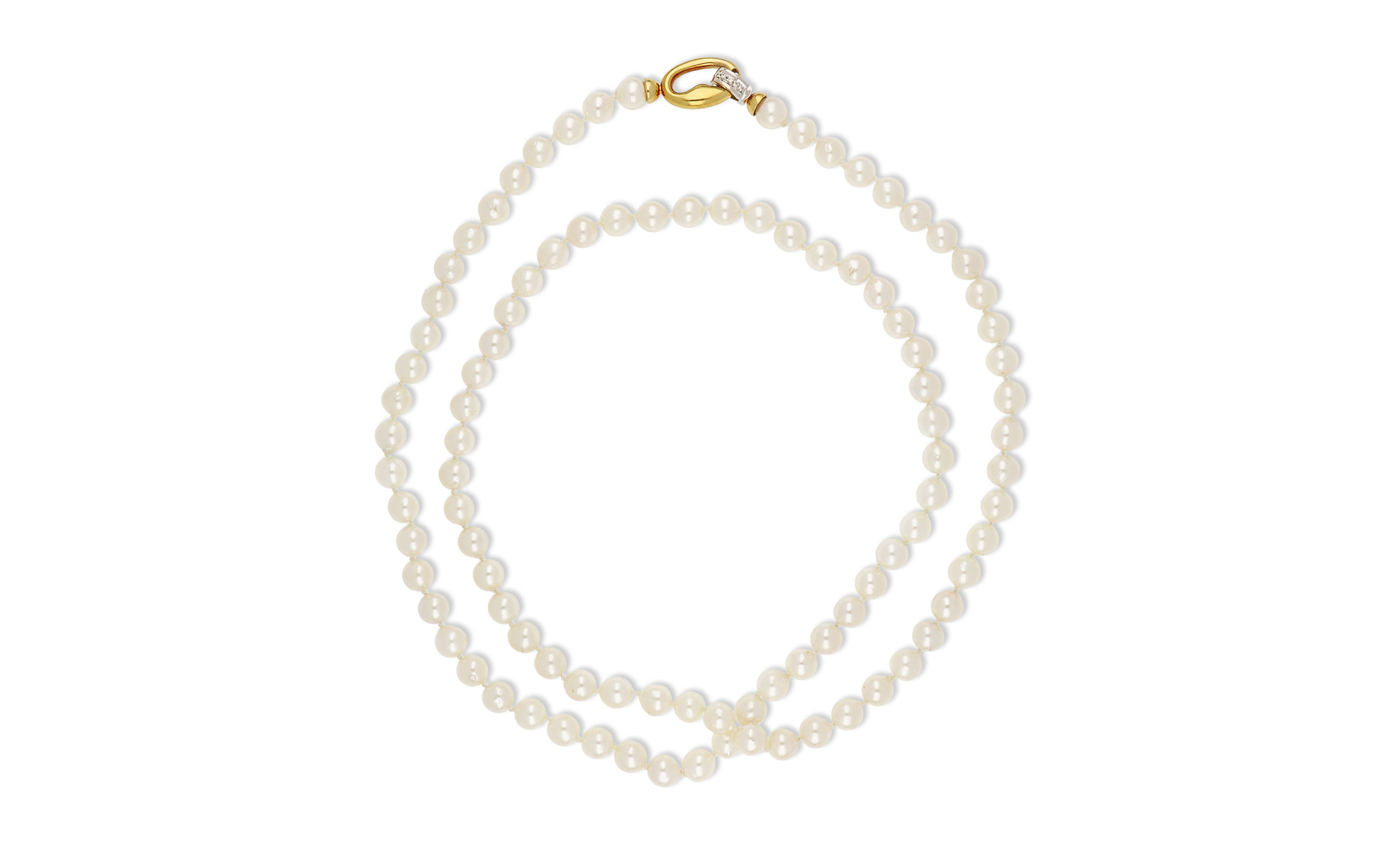 Lunga collana di perle giappone coltivate 8/8 5 mm di diametro chiuse da una fermezza in oro giallo e bianco di forma ovale.