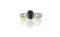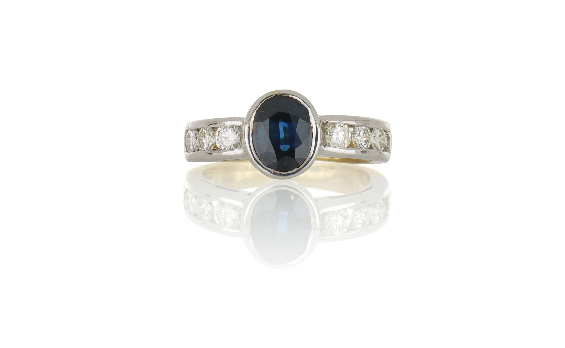 Anello in oro bianco e giallo il gambo a 'riviere' incassato con 8 diamanti taglio brillante è sormontato al centro da uno zaffiro taglio ovale di ct. 2 20 ca.