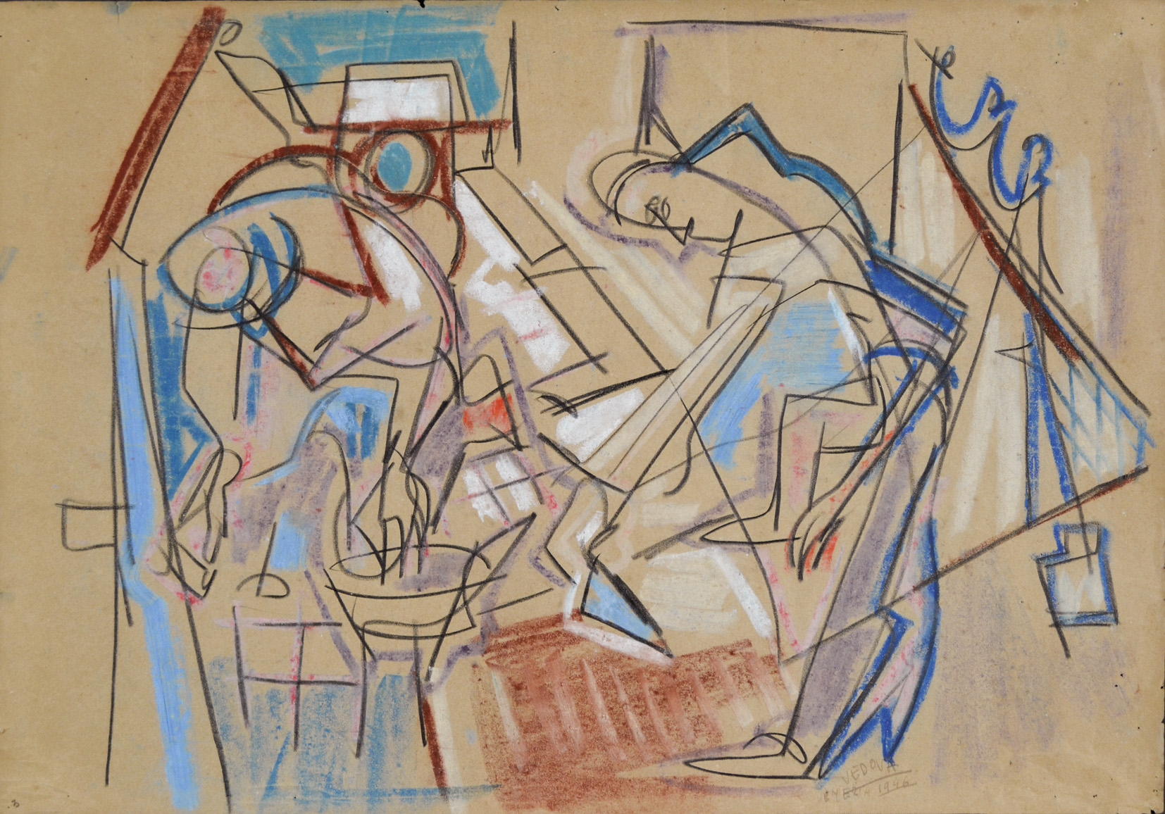 VEDOVA EMILIO Venezia 1919 - 2006 Anni poveri - Cucina 1946 pastelli e carboncino su carta 35x50 firma e data in basso a destra certificato di autenticità della Fondazione Emilio e Annabianca Vedova nr. Reg. FV13