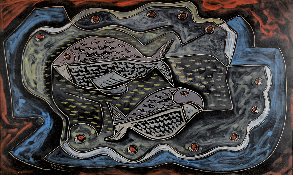 ORIANI PIPPO Torino 1909 - Roma 1972 Pesci (anni '60) encausto su cartoncino 30x50 firma in basso a sinistra autentica dell'Autore al retro e della Fondazione Pippo Oriani nr. Rep. 212 su foto esposizioni: GalleriaTortora Ferrara - etichetta al retro