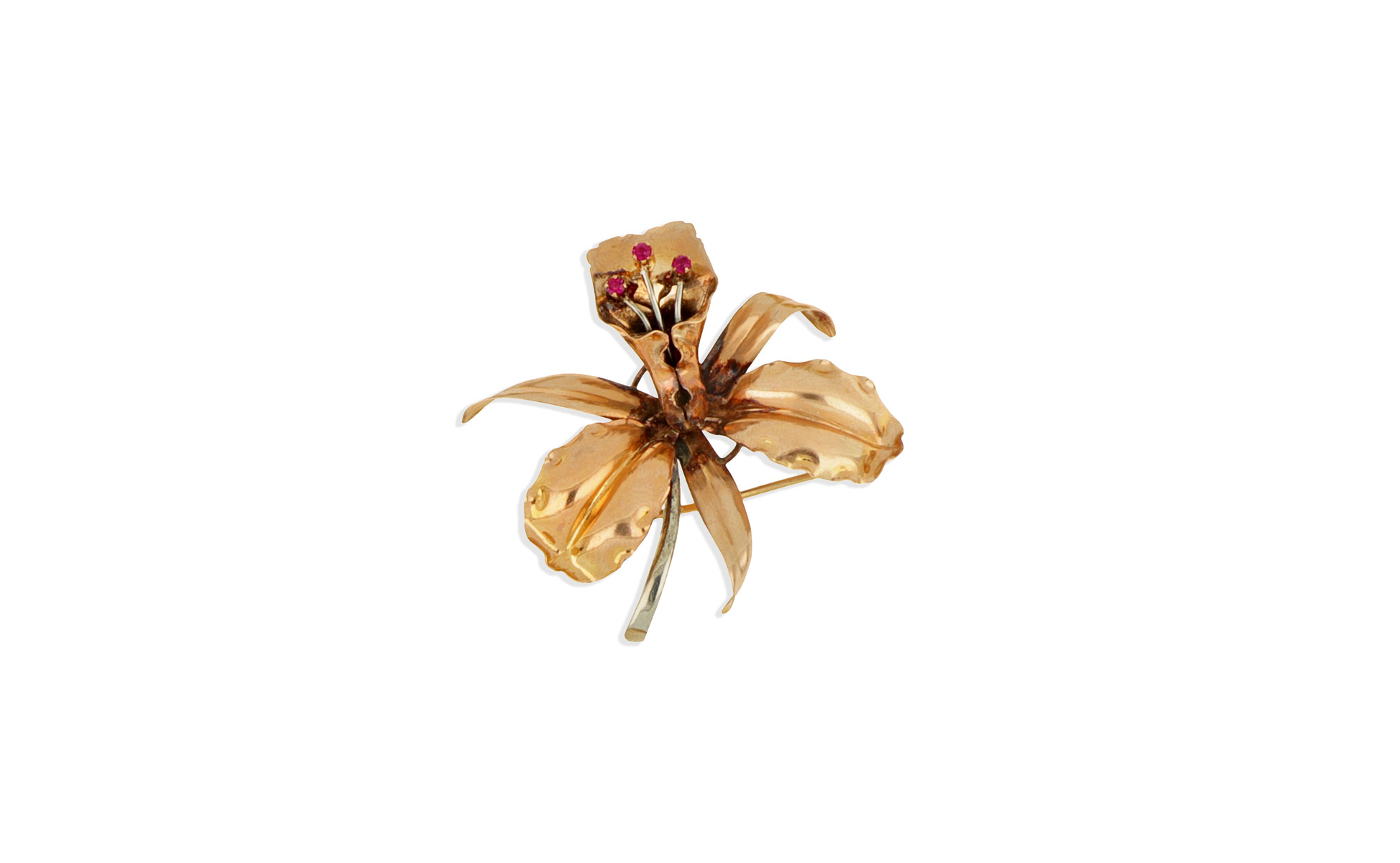 Spilla in oro rosso a forma di orchidea piccoli rubini negli stami.