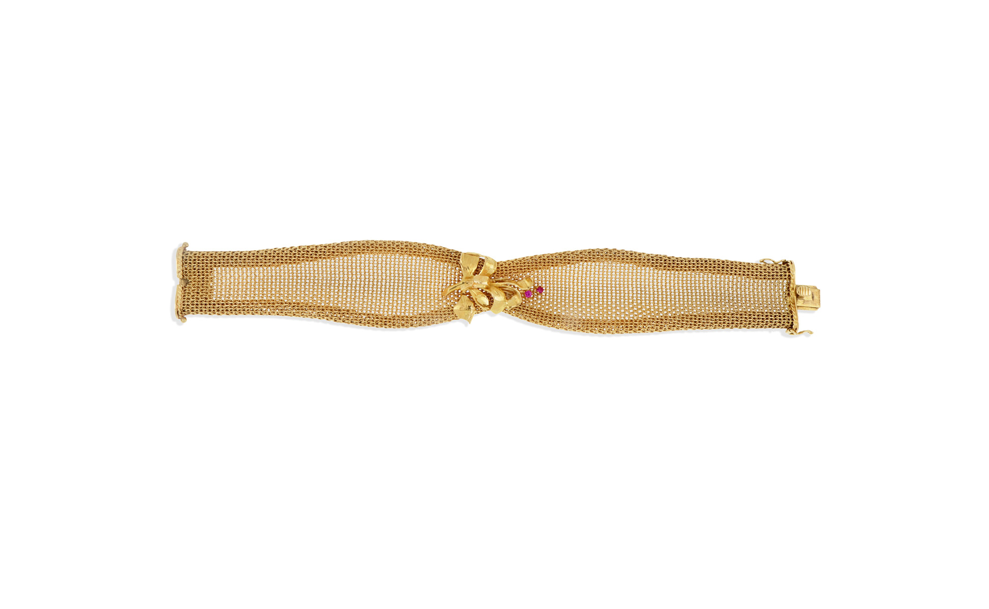 Bracciale in oro giallo a tessuto un nastro strozzato al centro da un riporto floreale si avvolge morbido al polso.
