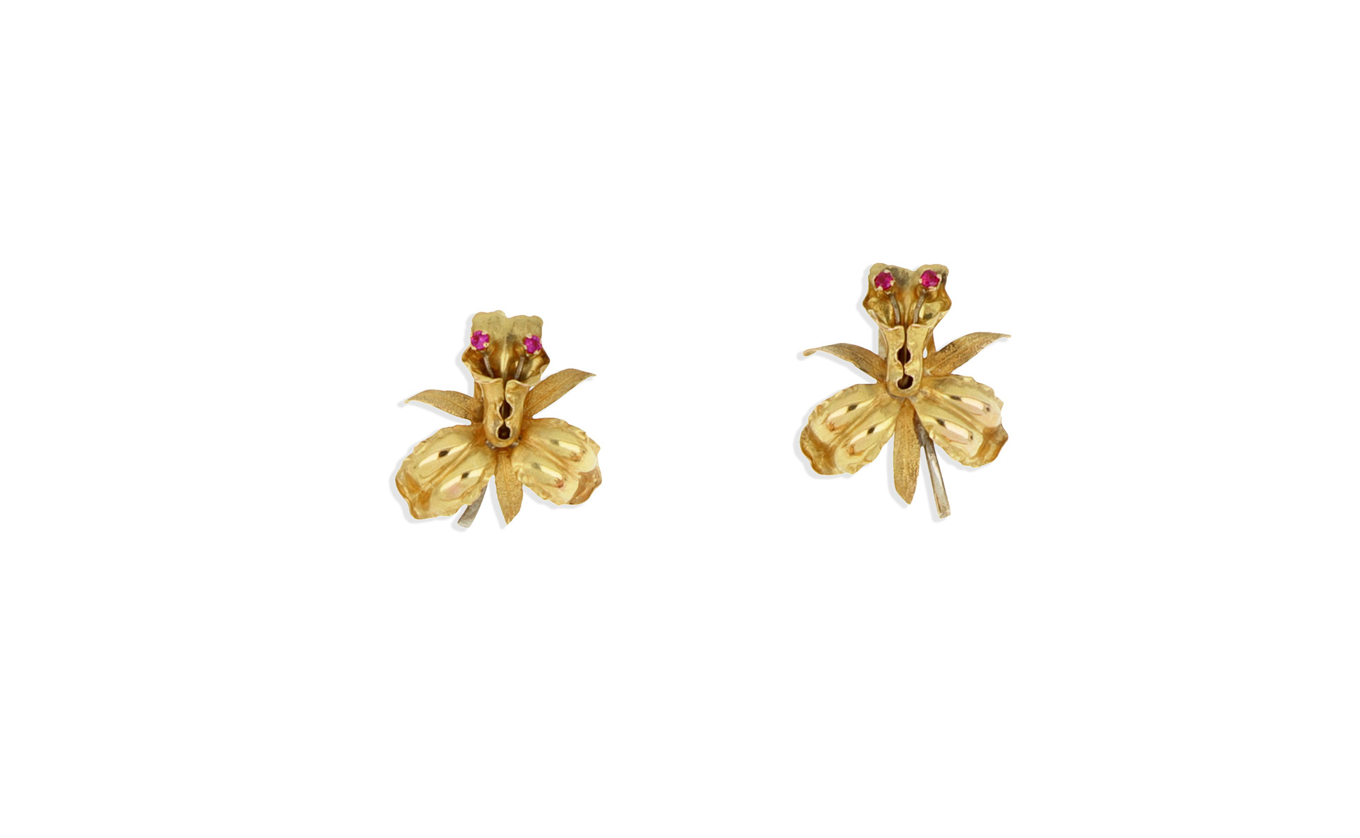 Orecchini in oro giallo a forma di orchidea piccoli rubini negli stami.