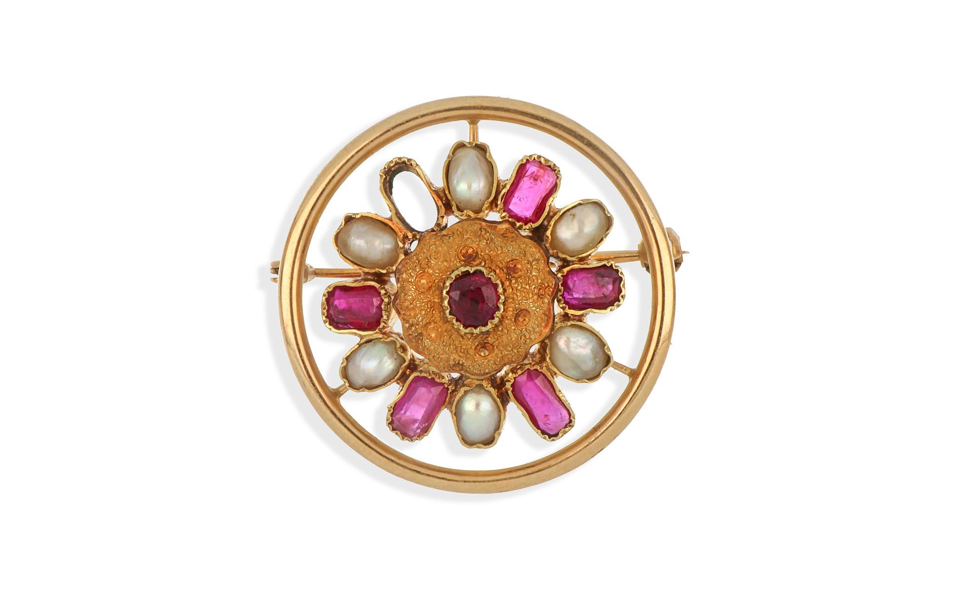 Spilla a rosone di fine 800 in oro giallo con rubini birmani taglio smeraldo e piccole perline.