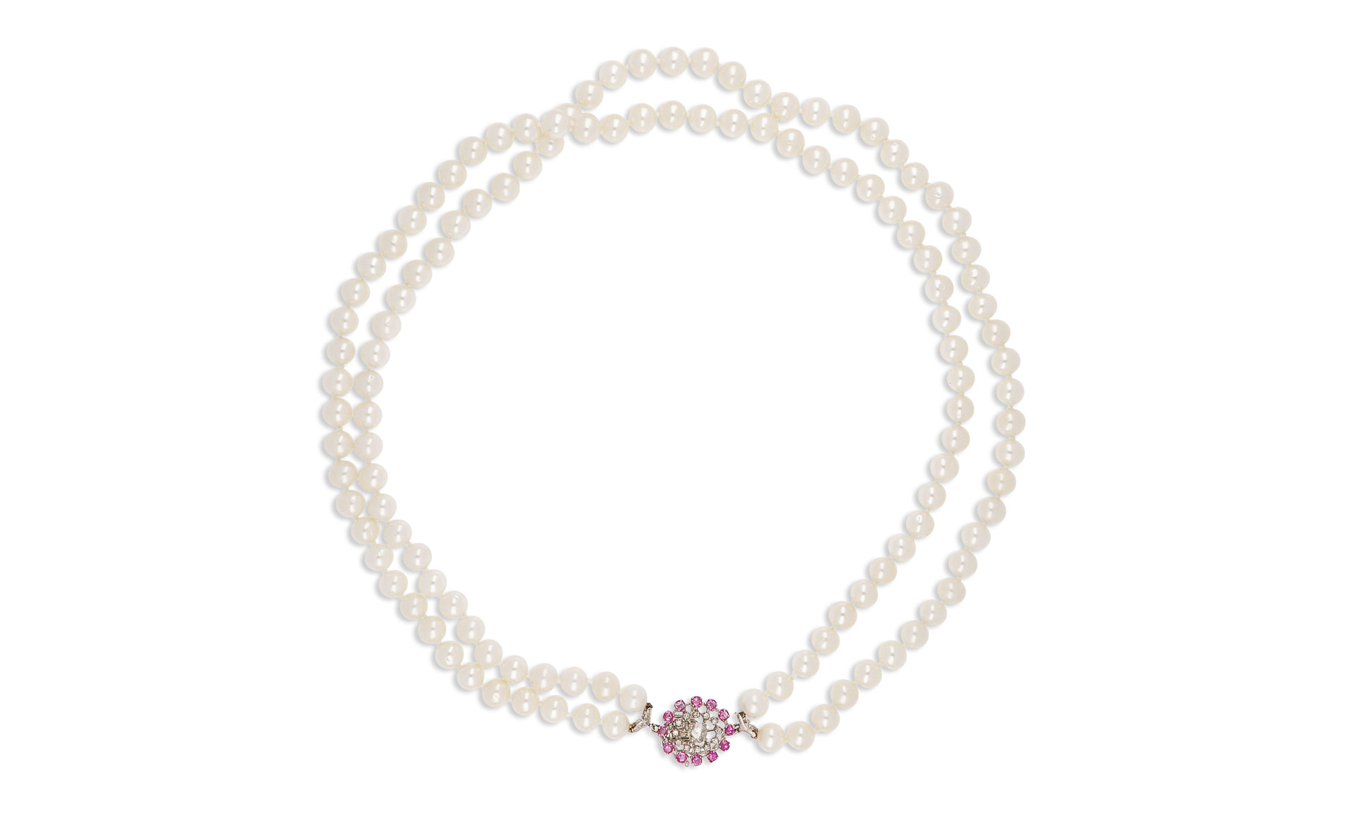 Girocollo di perle coltivate a due fili al centro chiusura in oro bianco a rosone con zaffiri rosa taglio rotondo e piccoli diamanti uno piu' grande taglio rosa al centro.