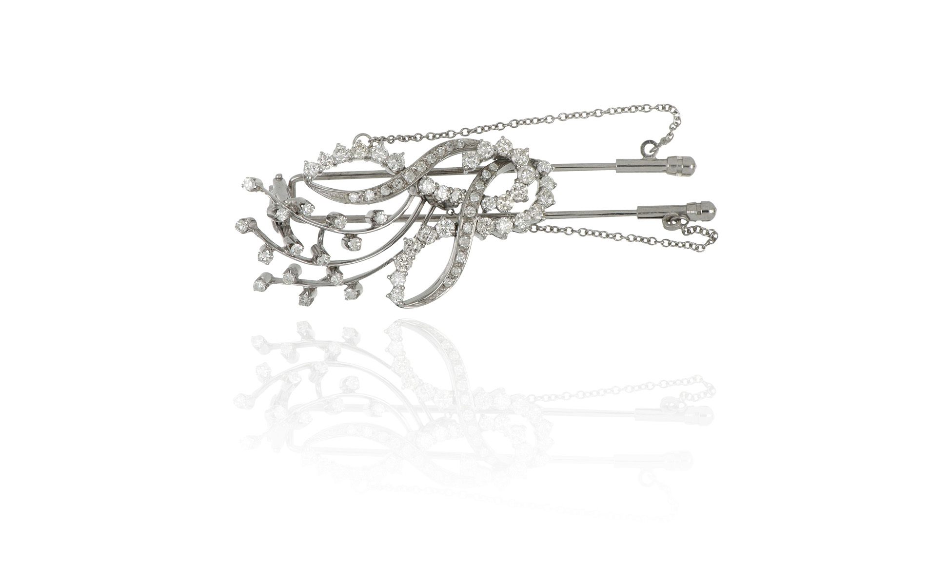 Spilla in oro bianco da cappotto piccoli diamanti taglio 8/8 e brillante per ct. 1 00 ca. disegnano volute a ramage stilizzati.