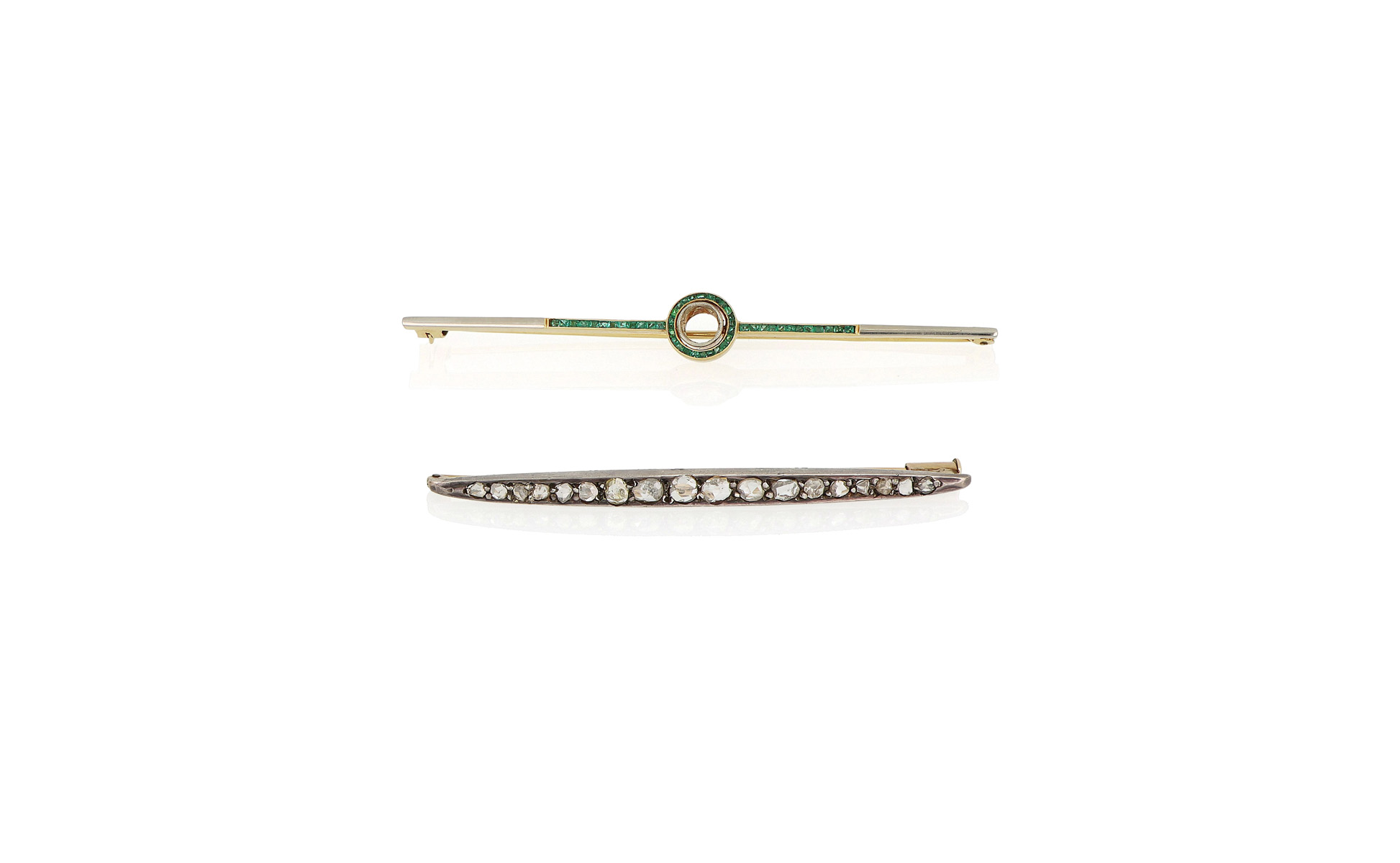 Coppia di spille a barretta in oro e argento rispettivamente con diamanti taglio a rosa e piccoli smeraldi.