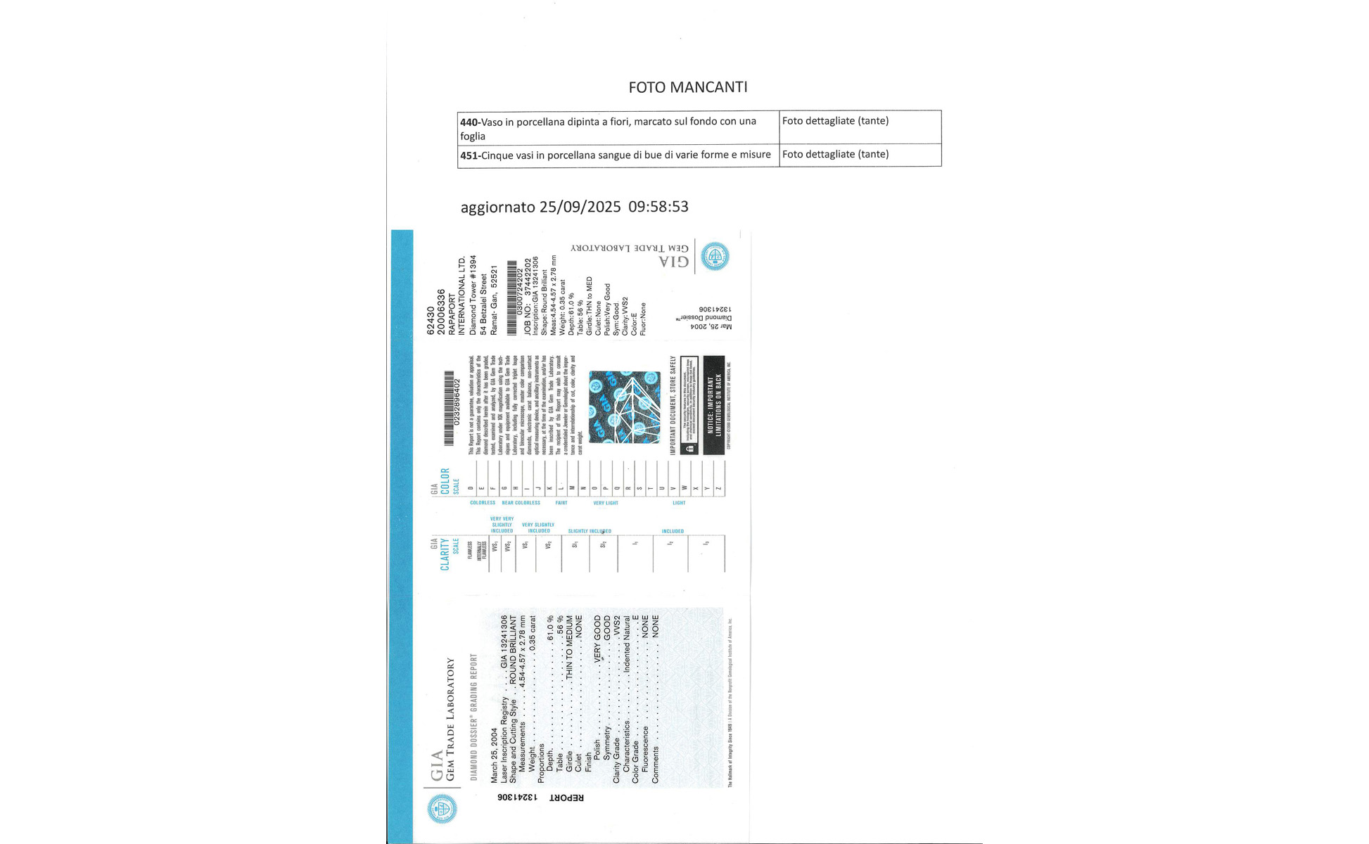 Diamante sciolto di forma rotonda taglio a brillante di 0 35 ct accompagnato da report gemmologico GIA attestante il colore E e la purezza VVS2 Taglio VG/G Fluo None