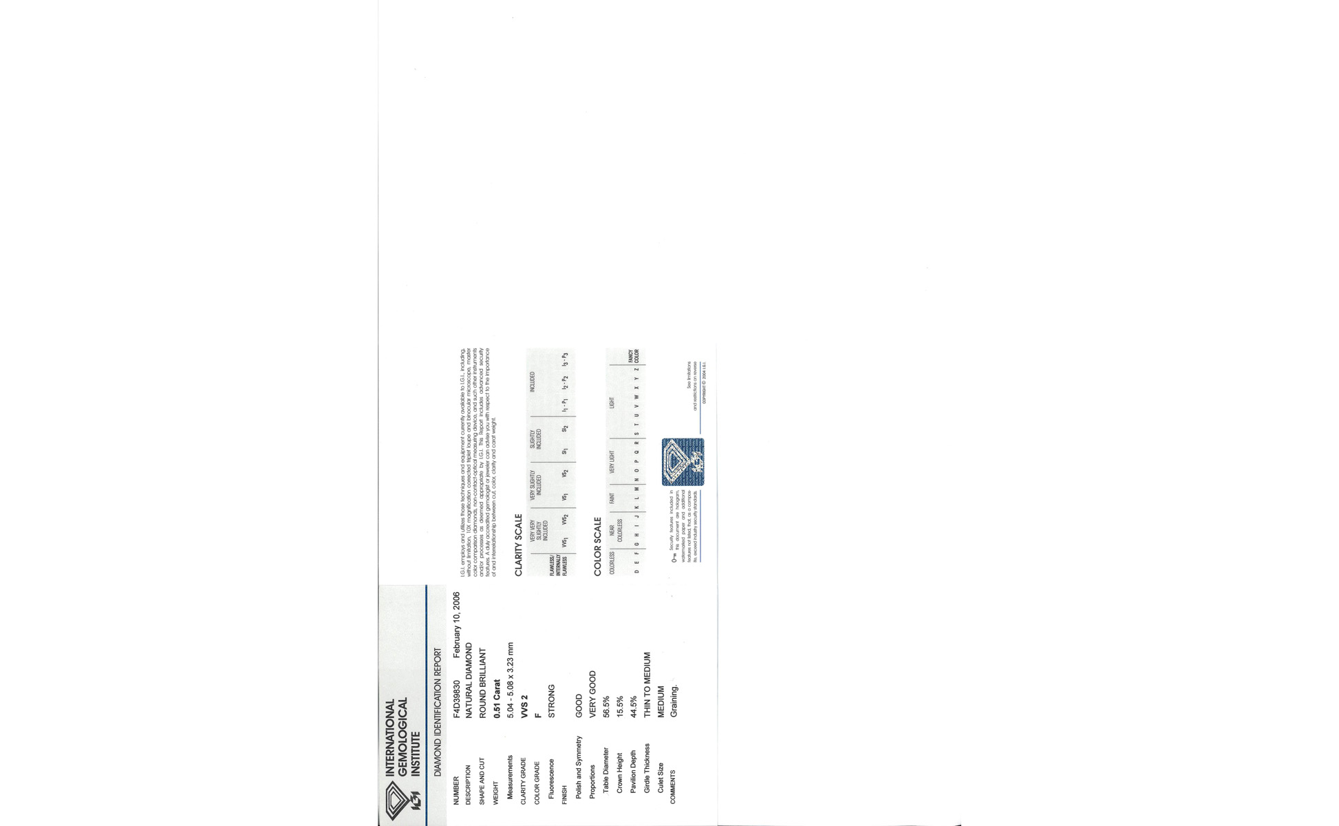Diamante sciolto di forma rotonda taglio a brillante di 0 51 ct accompagnato da report gemmologico IGI Antwerp attestante il colore F e la purezza VVS2 Taglio G/VG Fluo Strong.