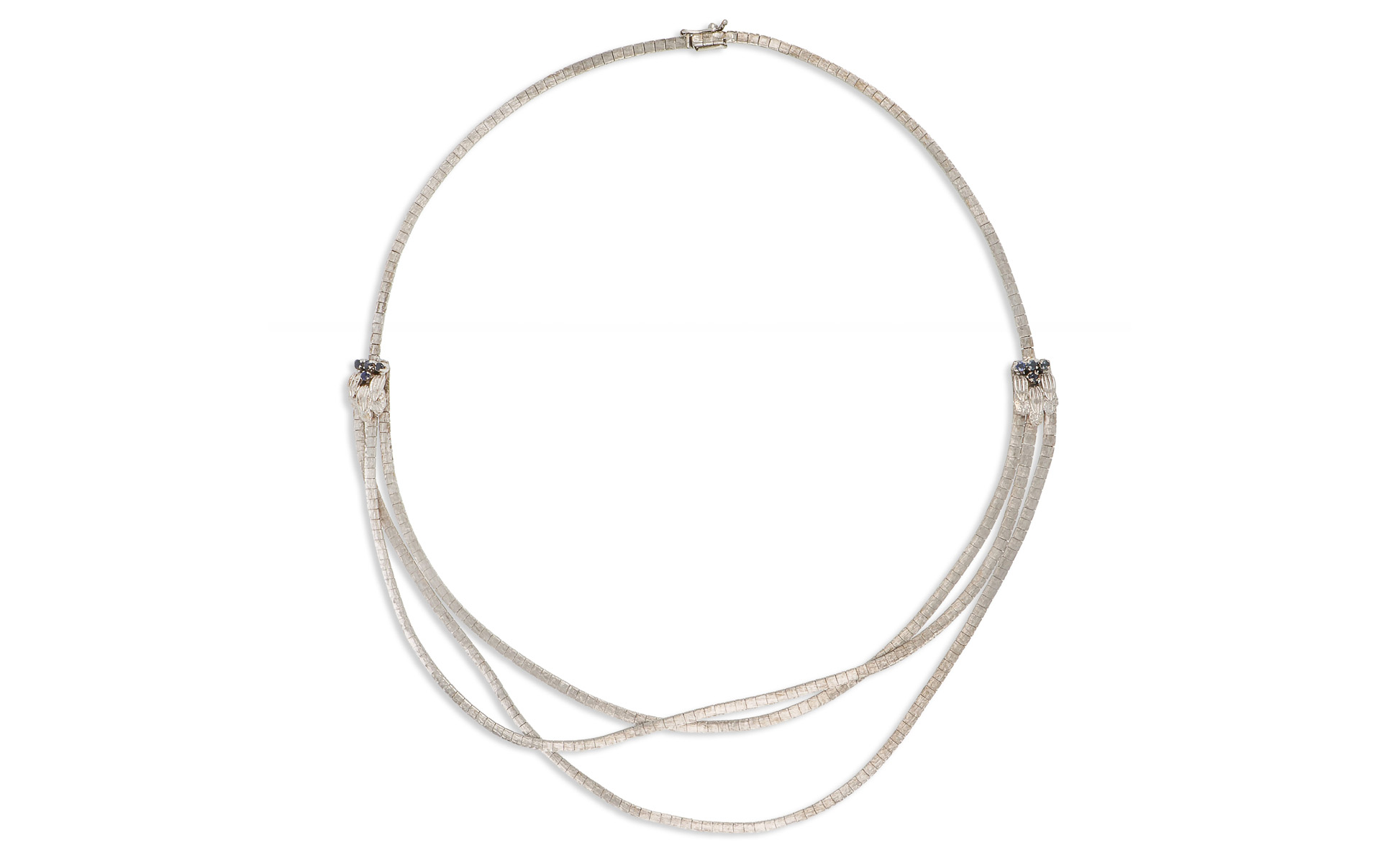 Girocollo in oro bianco realizzato con maglia satinata a mandorla si divide in 3 nella parte centrale.