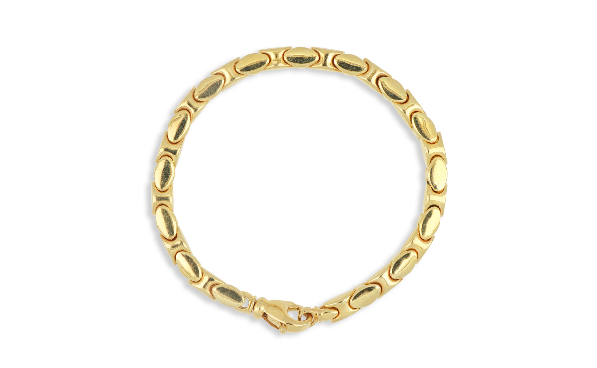 Bracciale in oro giallo con elegante maglia a sezione quadrata e pianta ovale.