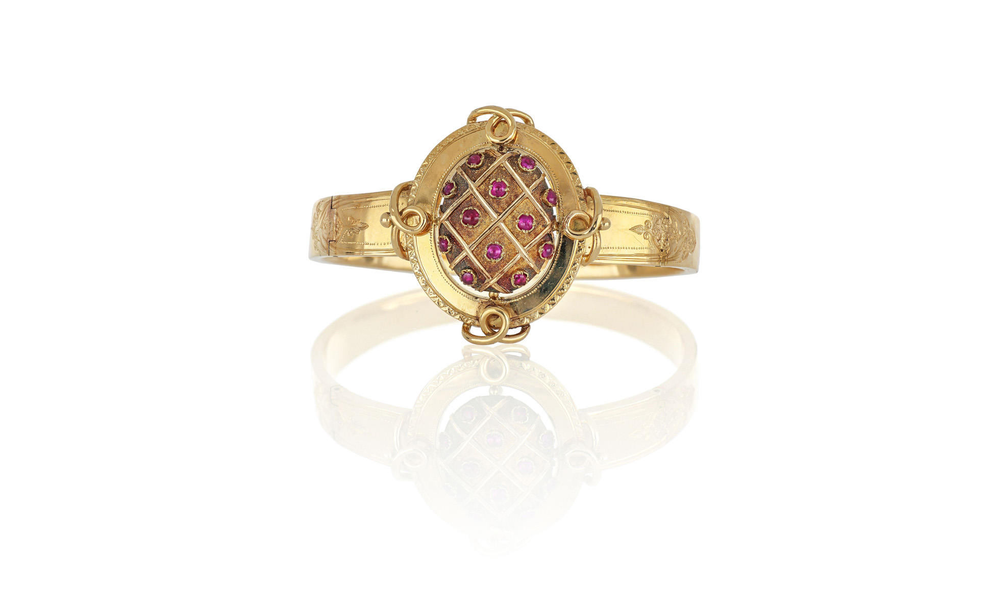 Bracciale tardo '800 in oro rosso realizzato in lastra nel medaglione centrale inciso 12 rubini sono incassati a decoro.