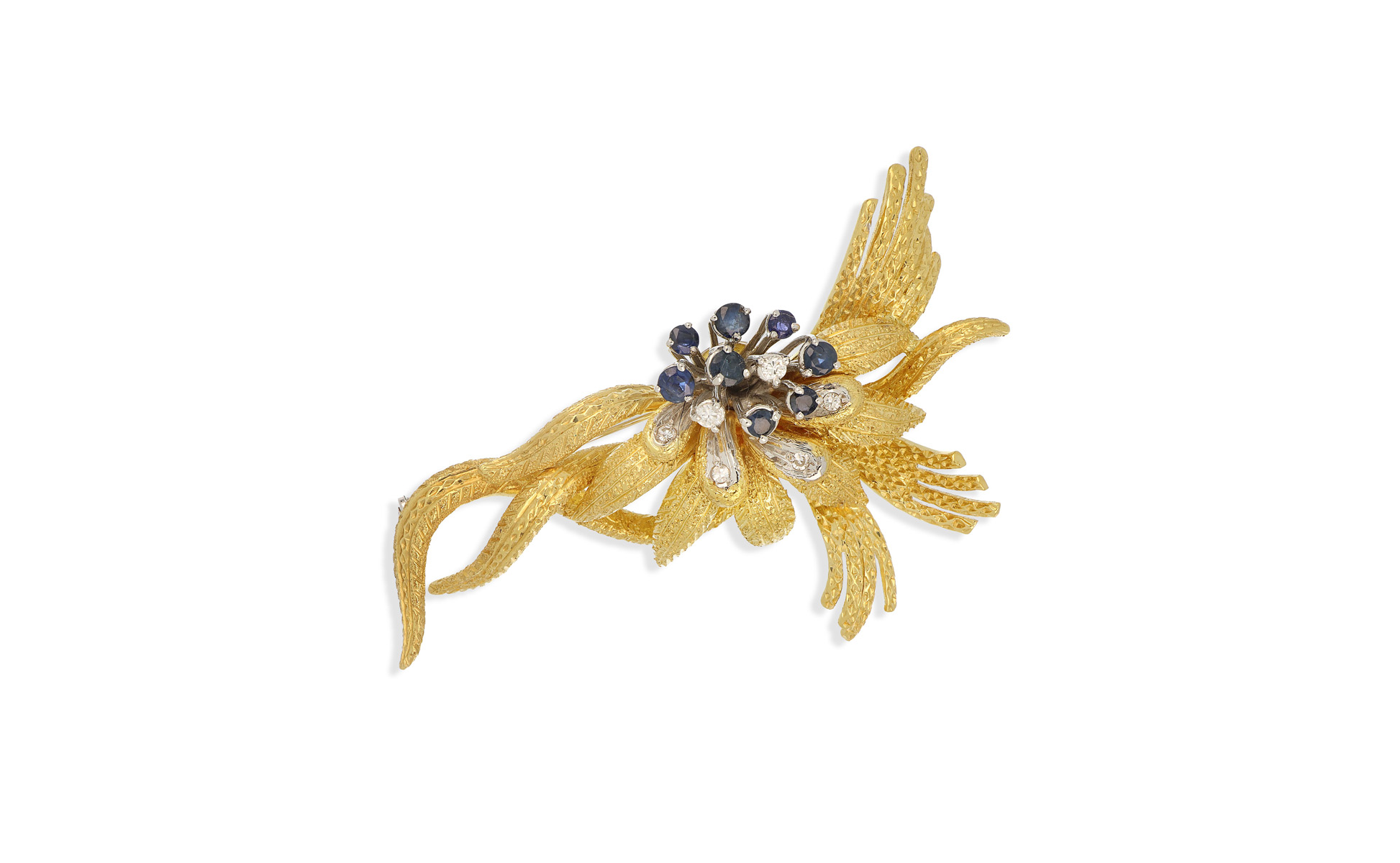 Spilla in oro giallo e bianco il motivo floreale è decorato con piccoli zaffiri e diamanti.