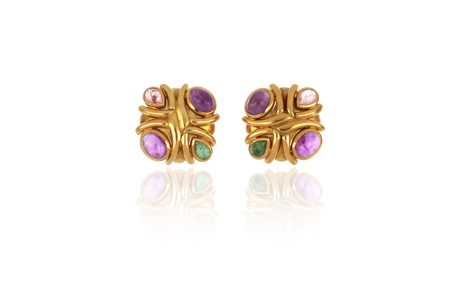 Orecchini in oro giallo con pietre semipreziose taglio cabochon lavorazione alla maniera di Bulgari.