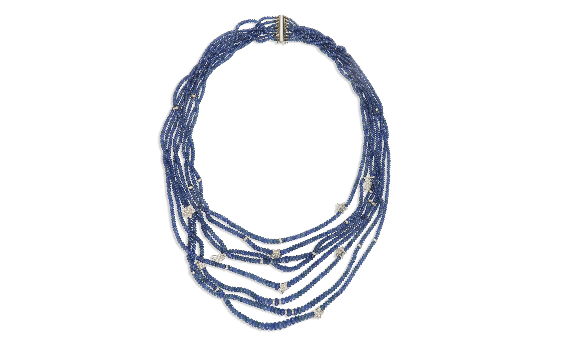Collana girocollo con 8 fili a scalare di zaffiri taglio a briolette forati per stimati 400 ct circa con inserti in oro bianco e diamanti.