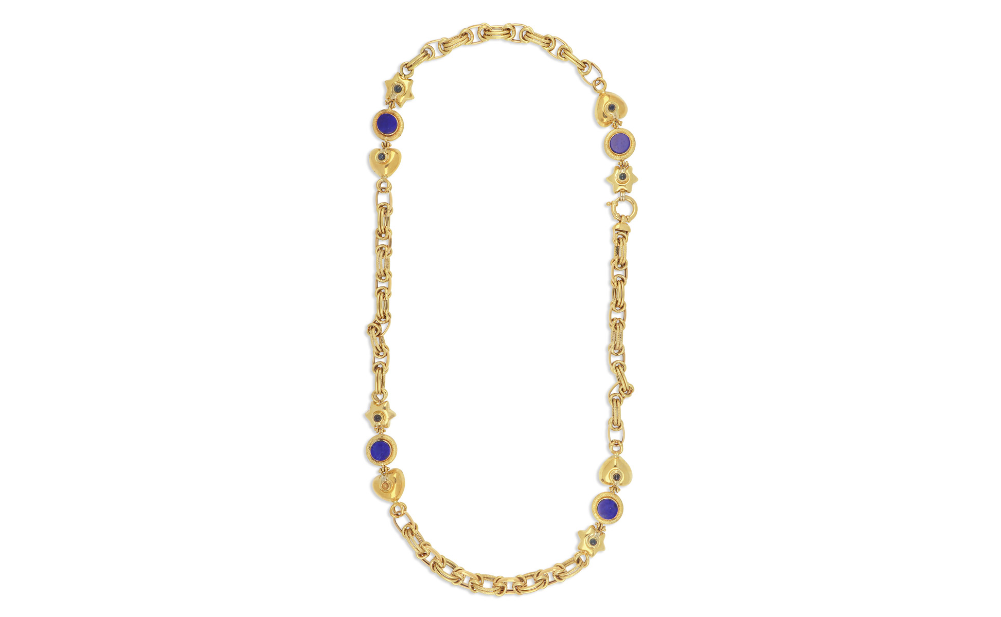 Lunga collana in oro giallo particolare lavorazione martellata con settori decorati con lapislazzuli e piccoli zaffiri cabochon.