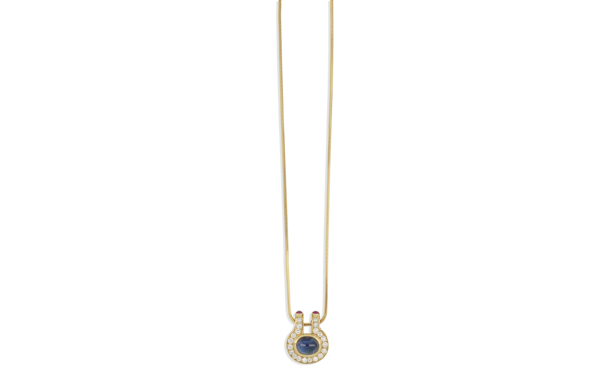 Girocollo in oro giallo una catenina a coda di topo sottende un pendente in stile Bulgari al centro uno zaffiro taglio cabochon ovale di stimati ct. 5 0 contornato da diamanti taglio brillante per ct. 1 40 ca. e due piccoli rubini alla sommita'.