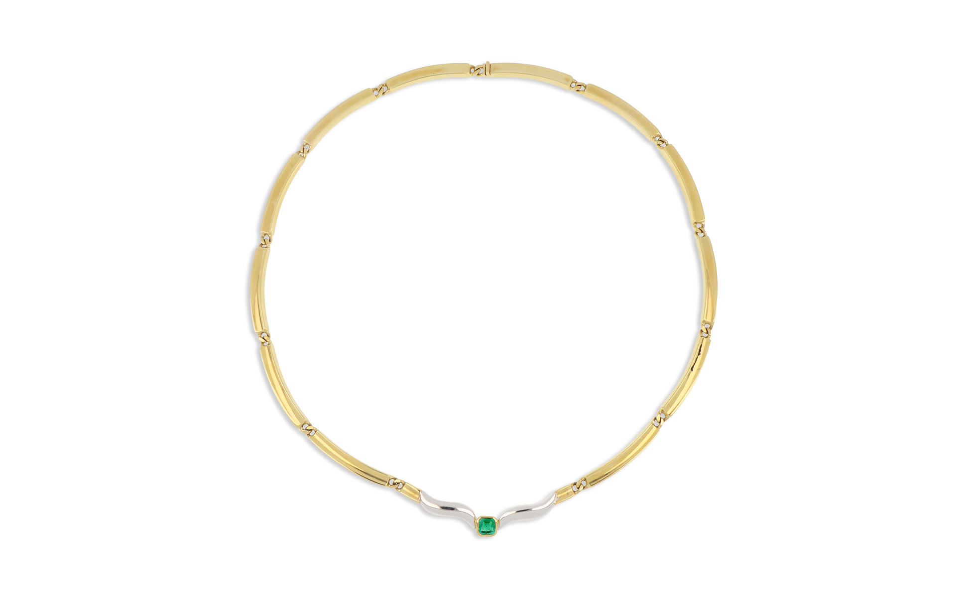 Girocollo in oro giallo a settori al centro un baffo in oro bianco è impreziosito da uno smeraldo colombiano di 1 0 ct. ca.