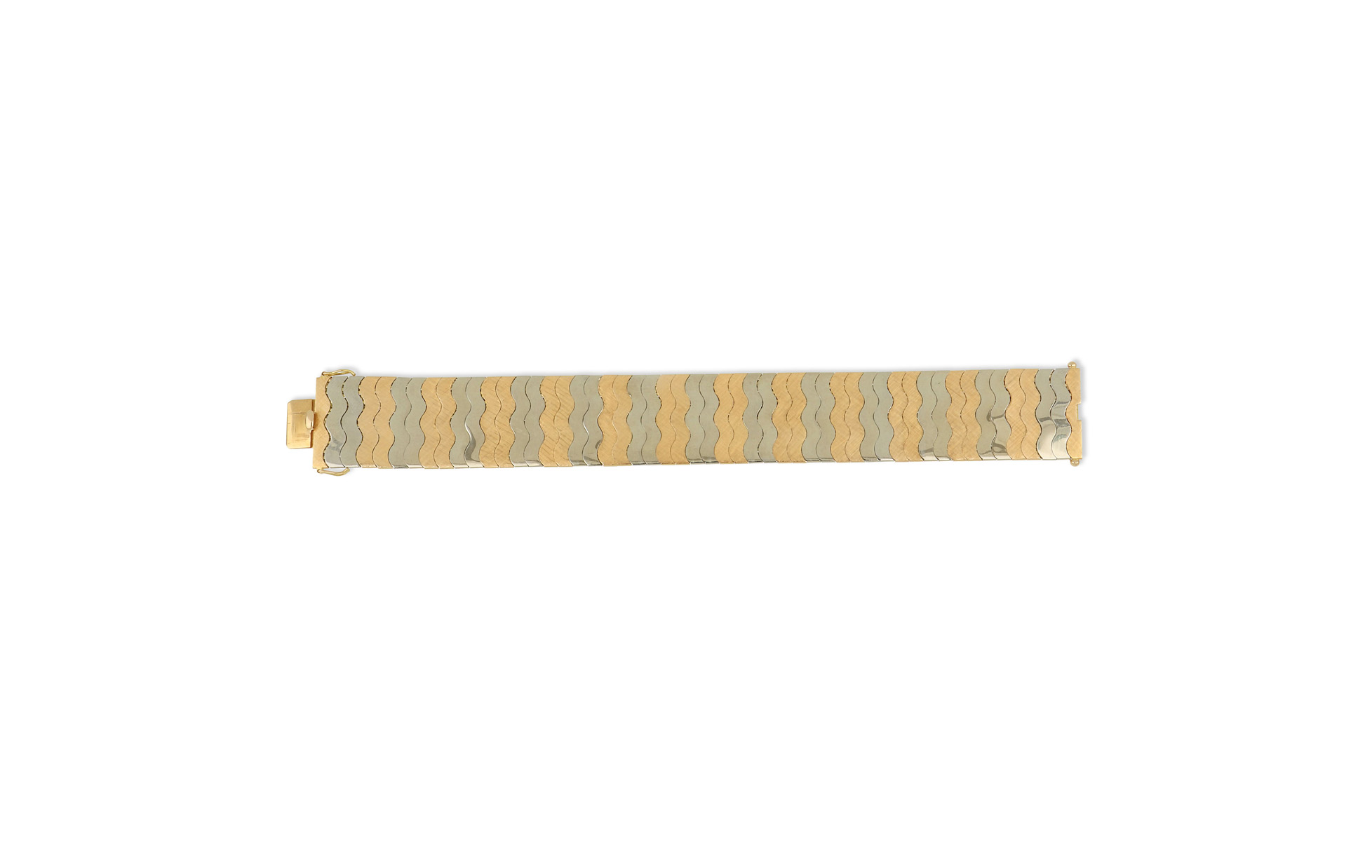 Bracciale a nastro nei colori dell'oro bianco e rosso satinato e lucido nella parte a vista e tessuto al retro.