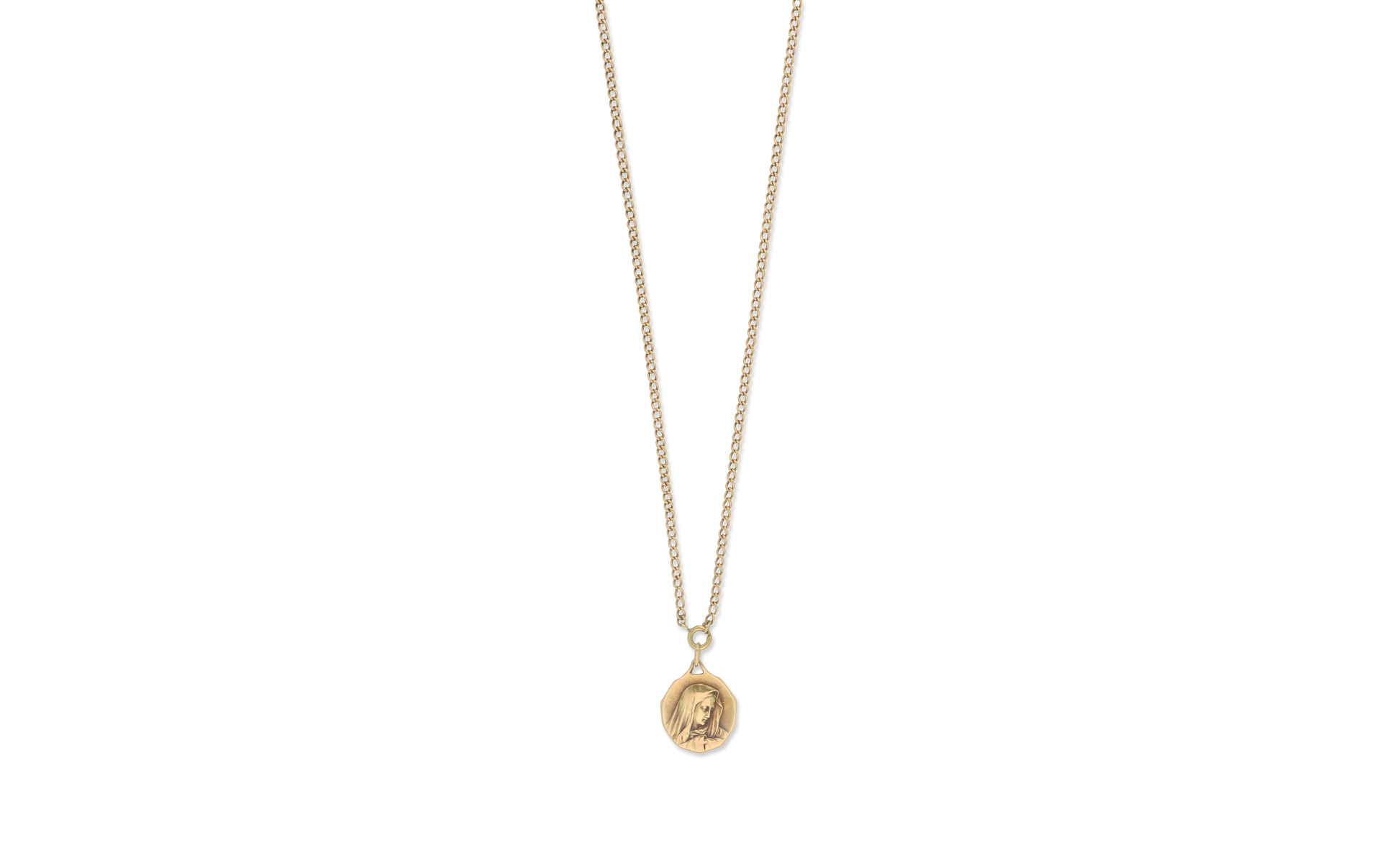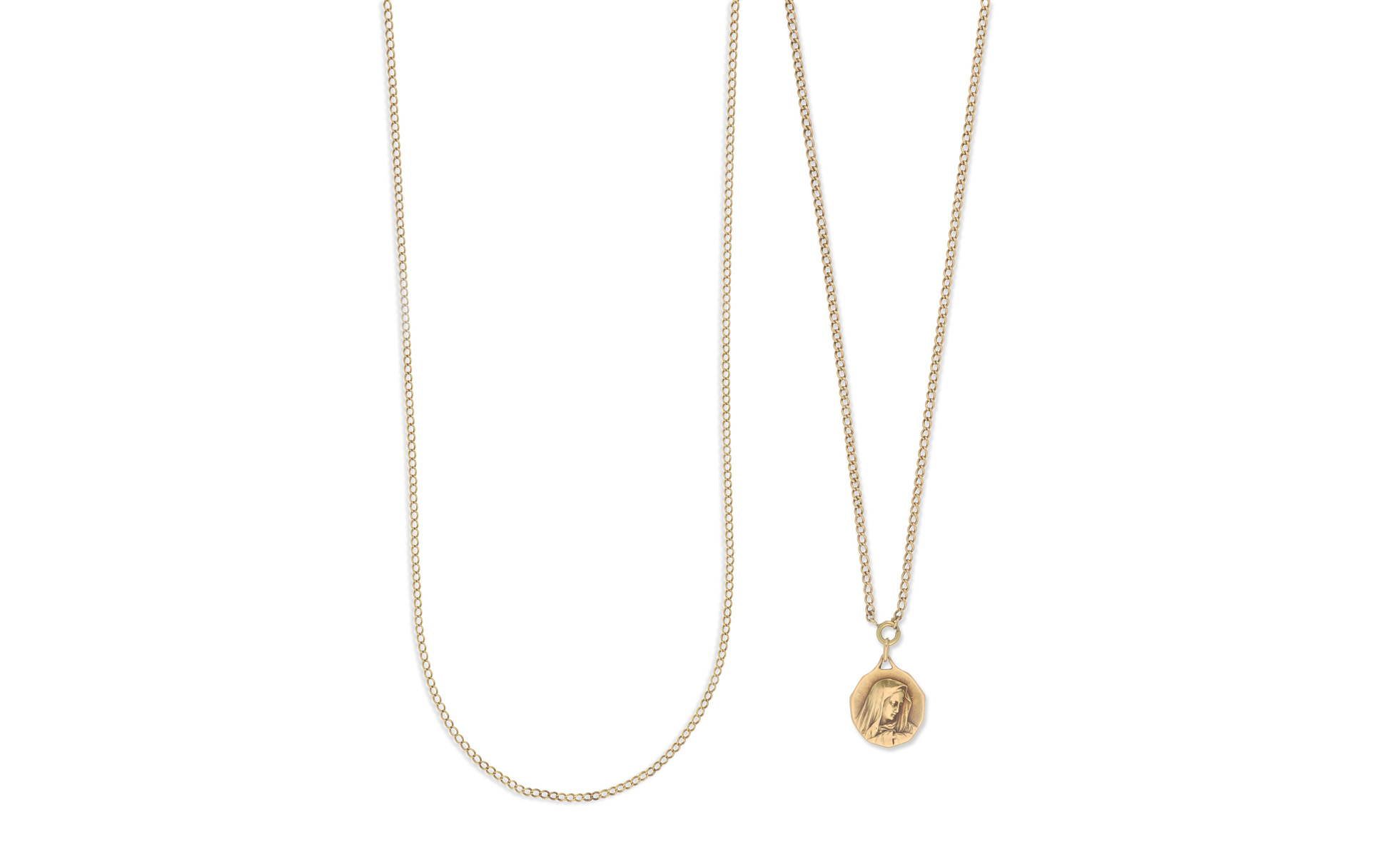 Lotto a peso composta da due catenine in oro giallo e un pendente votivo.