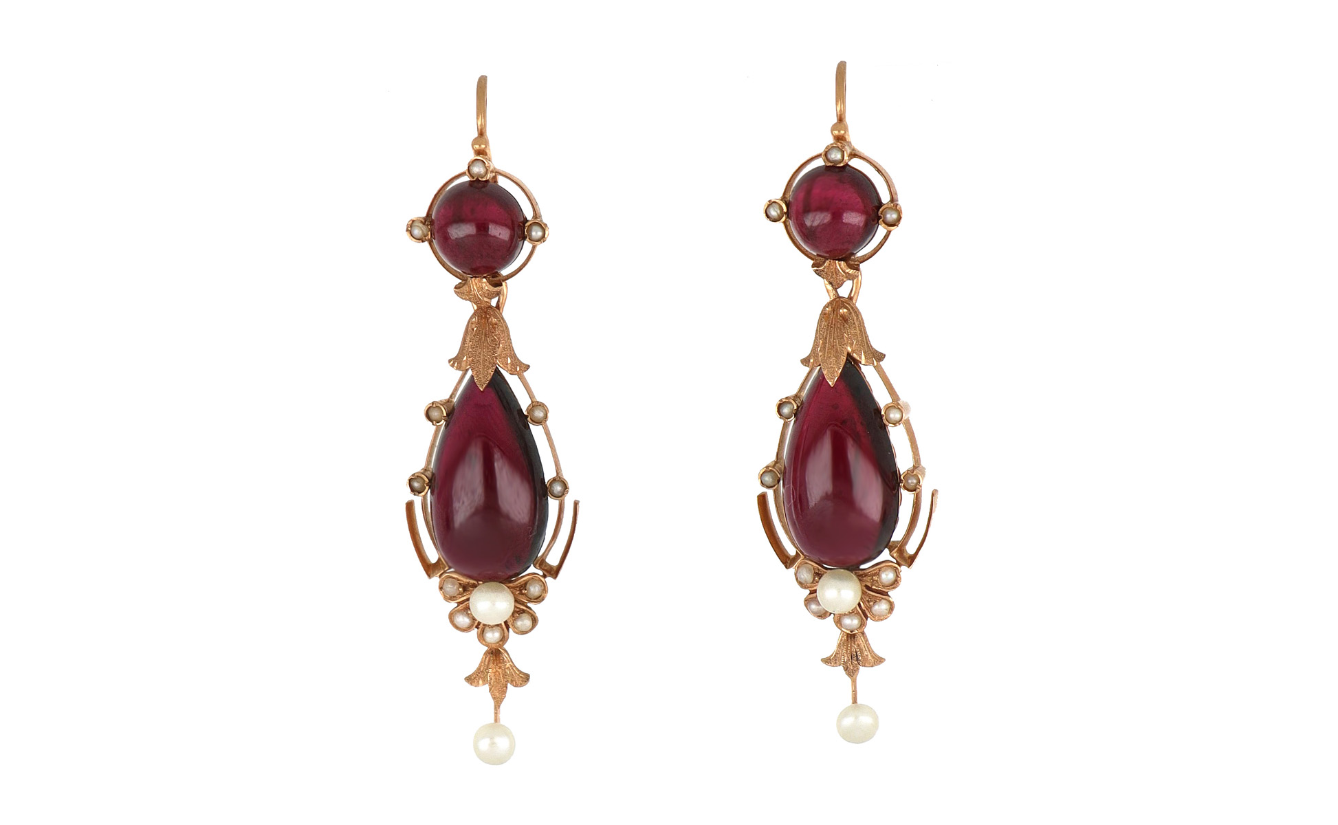 Demi parure composta da pendente bracciale e orecchini in oro rosso di antica manifattura il decoro con granati taglio cabochon è arricchito da piccole perline.