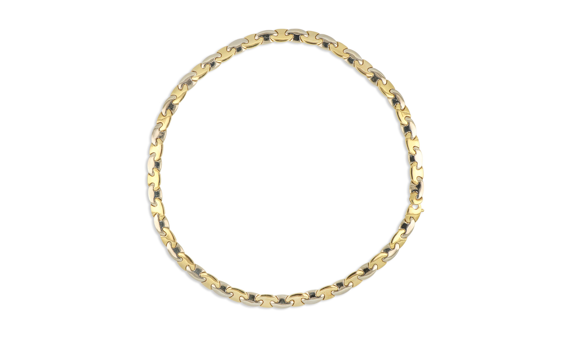 Girocollo in oro giallo e bianco maglie piatte a funghetto si rincorrono nella finitura lucida.
