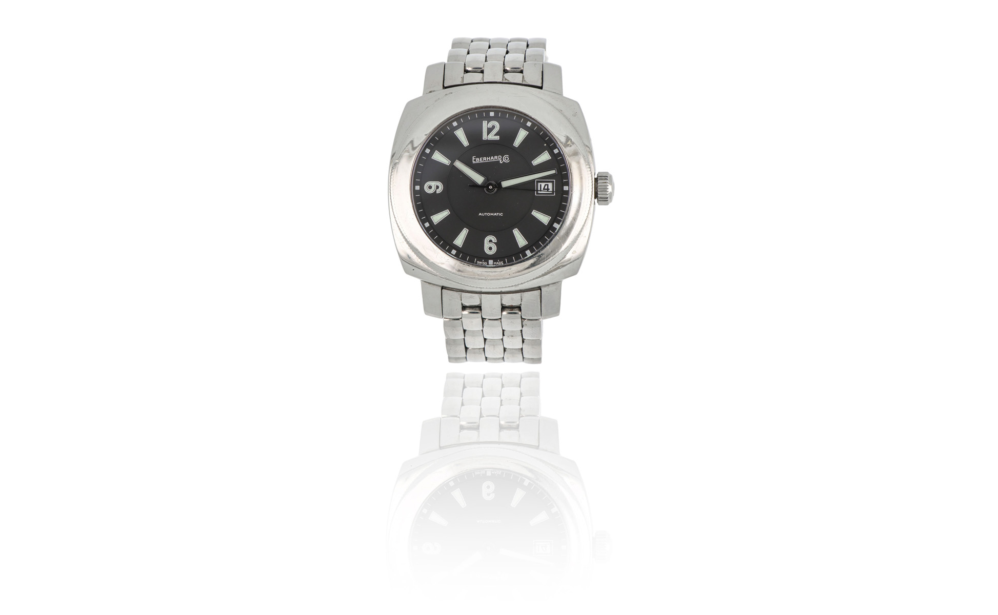EBERHARD - Modello Boucanier referenza 41019CA Orologio da polso in acciaio animato da movimento meccanico automatico bracciale a maglia in acciaio indici e sfere luminescenti quadrante nero piccola data ad ore 3 solo tempo con secondi al centro.